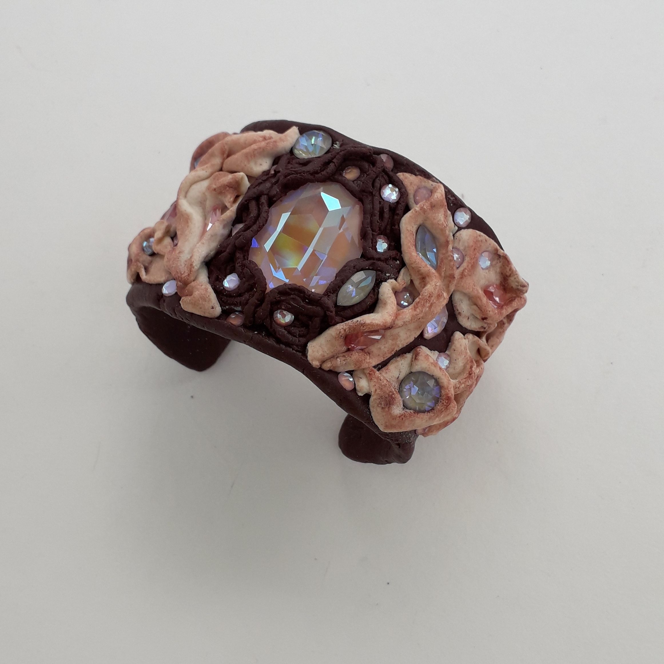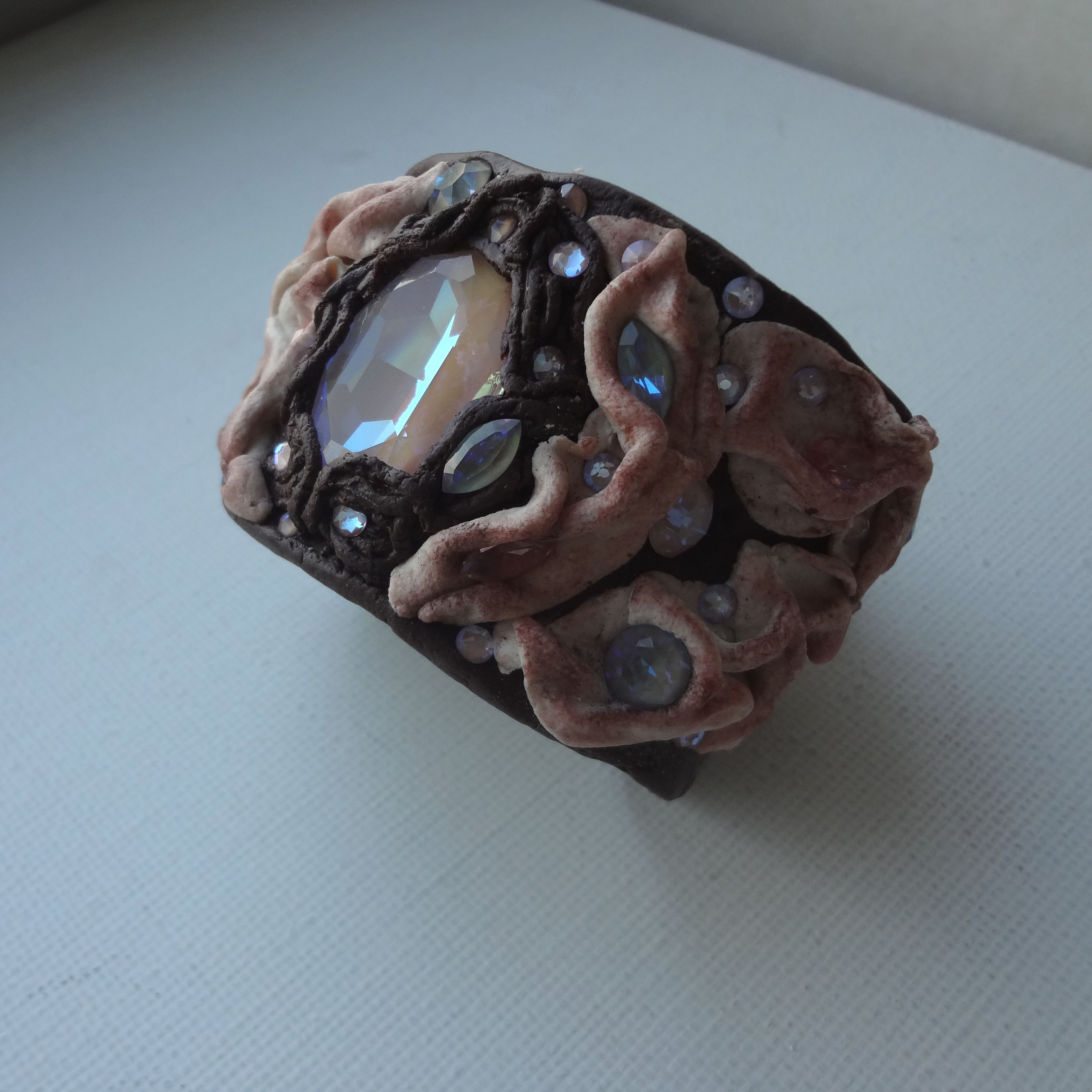 Что для нас означает кристалл? Идеал, совершенство, абсолют... Мы говорим: "Кристально чистый", "кристально ясный" и даже" кристально честный". А любовь! Определений много, но интересно представить, что любовь, как и диалектику, можно рассматривать как единство и борьбу противоположностей (например, люблю мороженое и ненавижу целлюлит). А в моем браслете объединились теплая цветовая гамма с холодными искрами, идеальная четкость граней кристаллов с мягкими складками, непревзойденный блеск и прозрачность с эффектом пудры...Вот такая диалектика получилась...