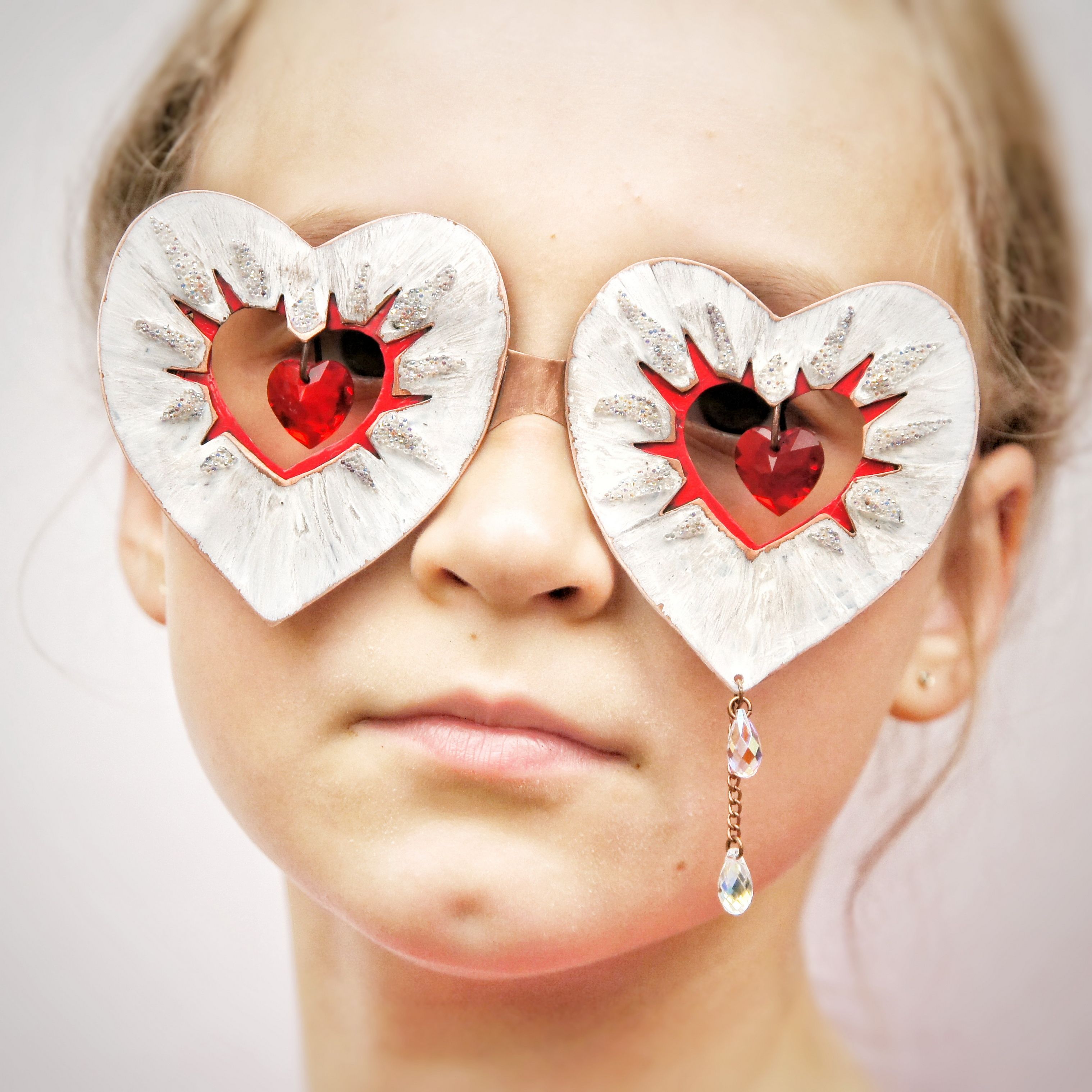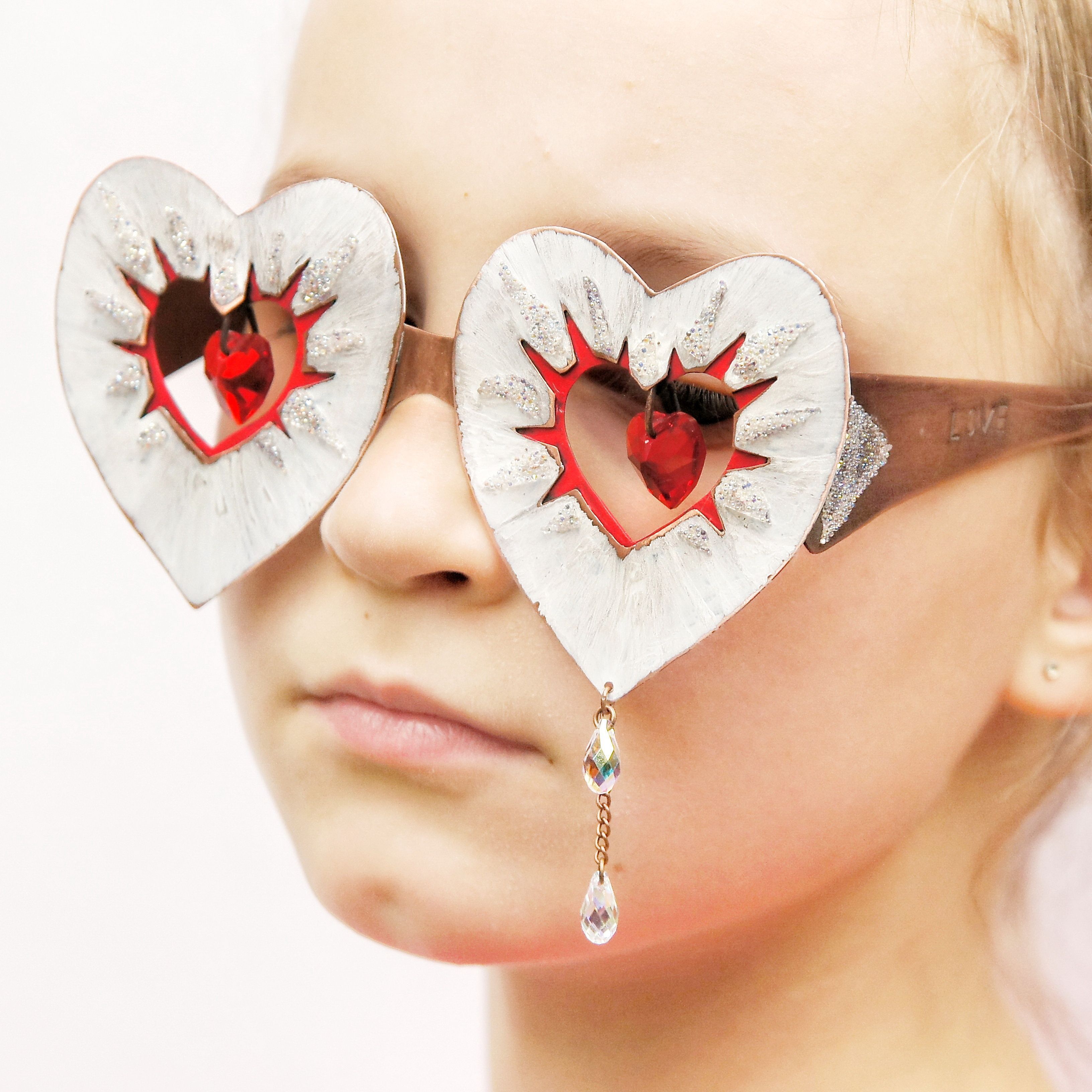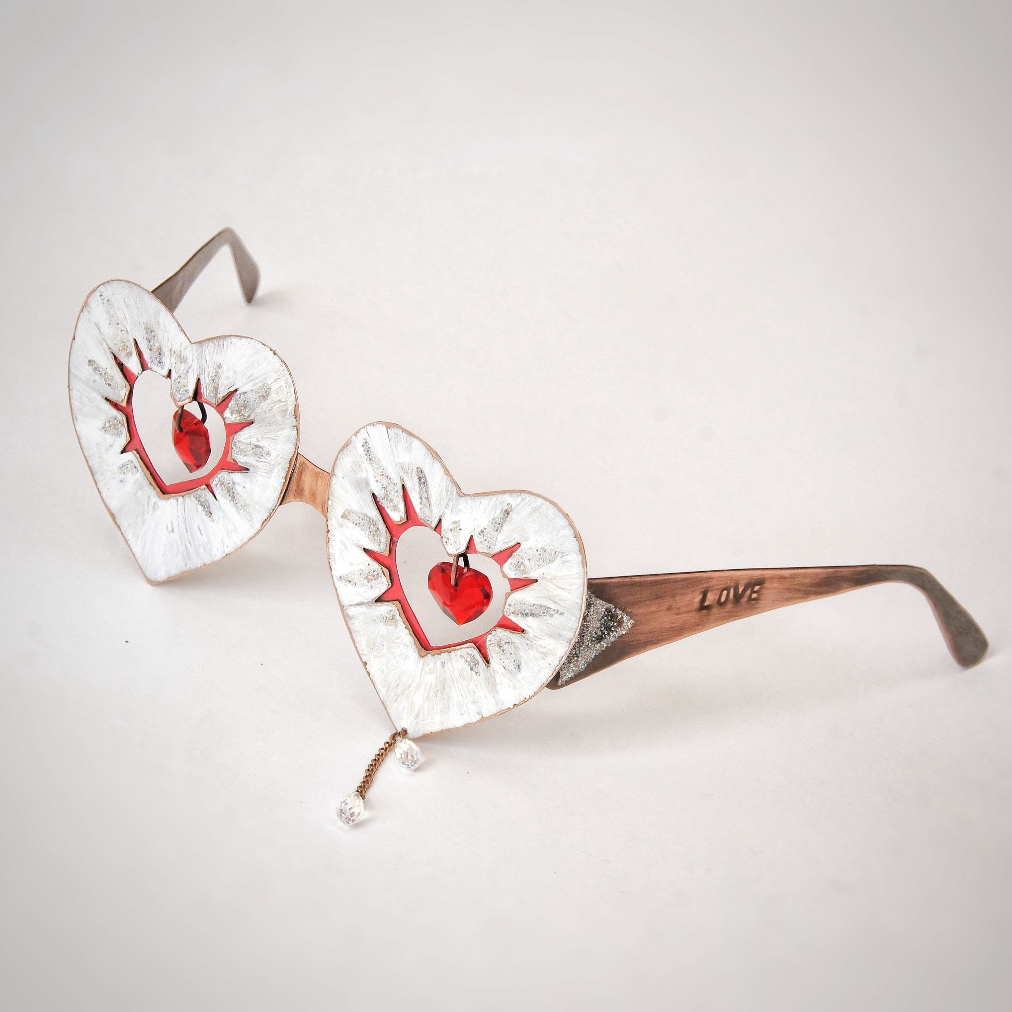 Очки LOVE выполнены из меди, покрыты разными патинами, оригинальны и многофактурны. Внешняя форма и внутреннее отверстие очков в форме сердца подчеркивает форму подвесок Сваровски, которые закреплены по центру. Подвески подвижны. От каждой подвески в стороны расходятся разнообразные «лучи»: белые – фактурная патина по металлу, «потертая временем», с проблескивающей кое-где медной основой; красные – фигурная выпиловка с цветной патиной, сверкающие – кристальная ткань.