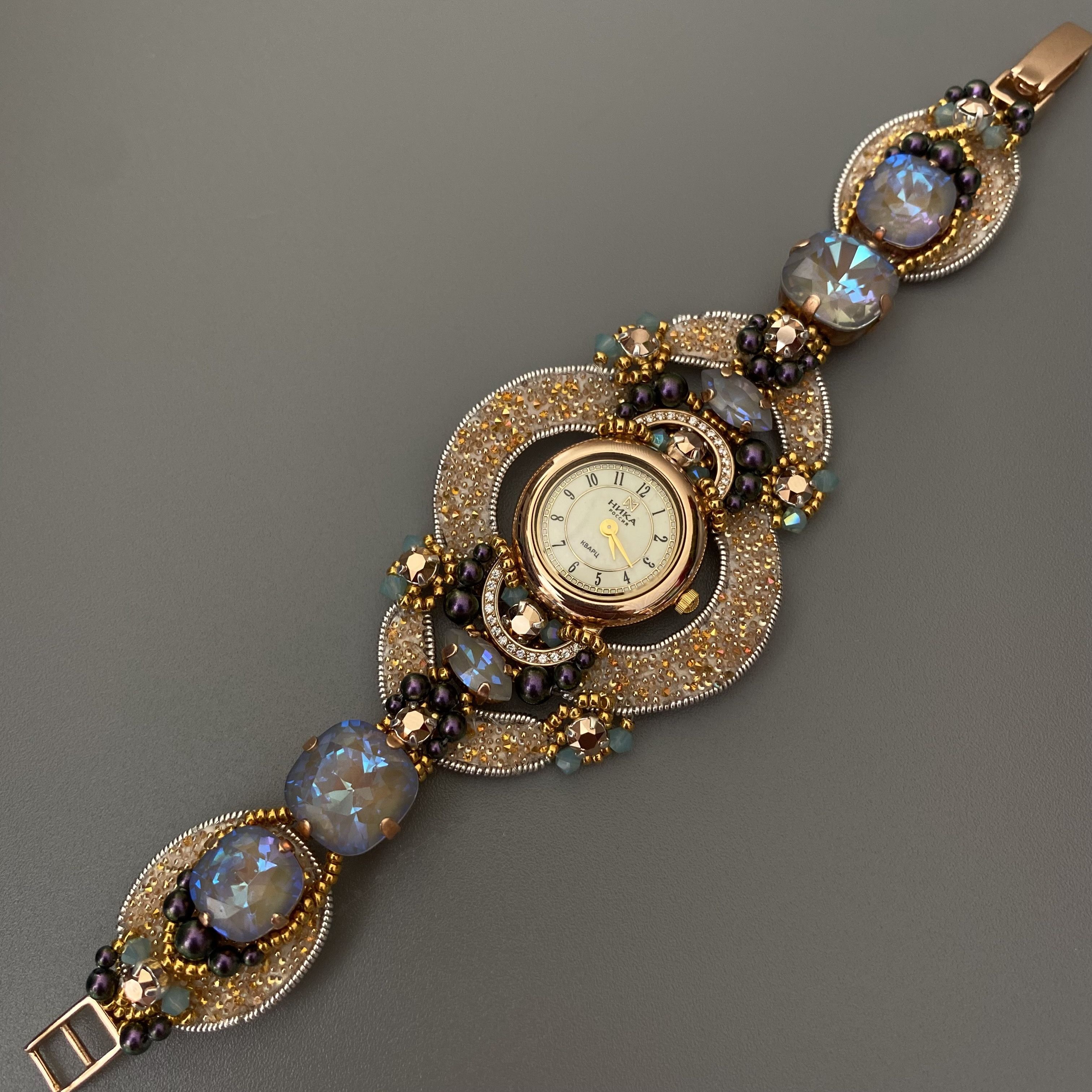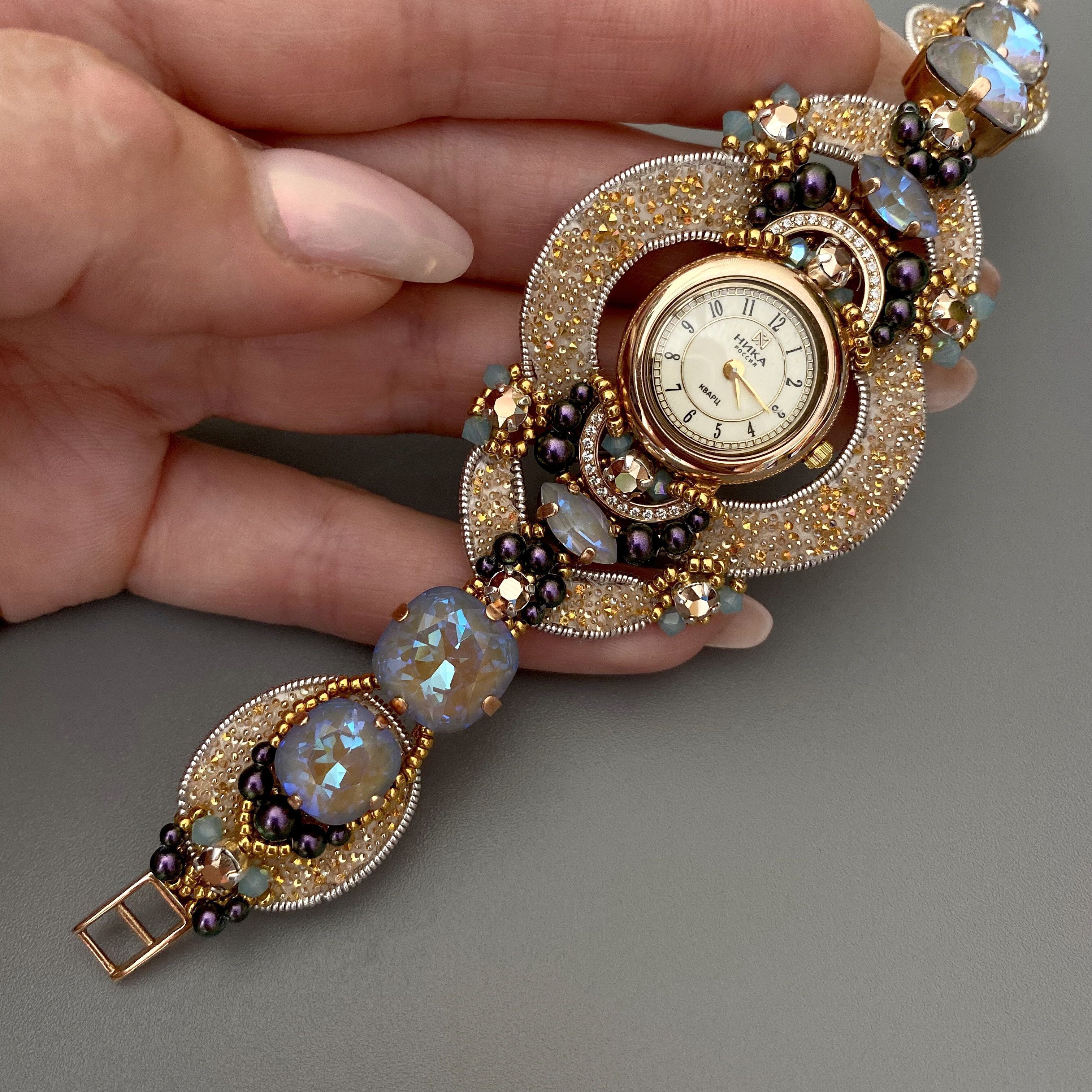 Браслет часов состоит из кристальной ткани и потрясающей красоты кристаллами.