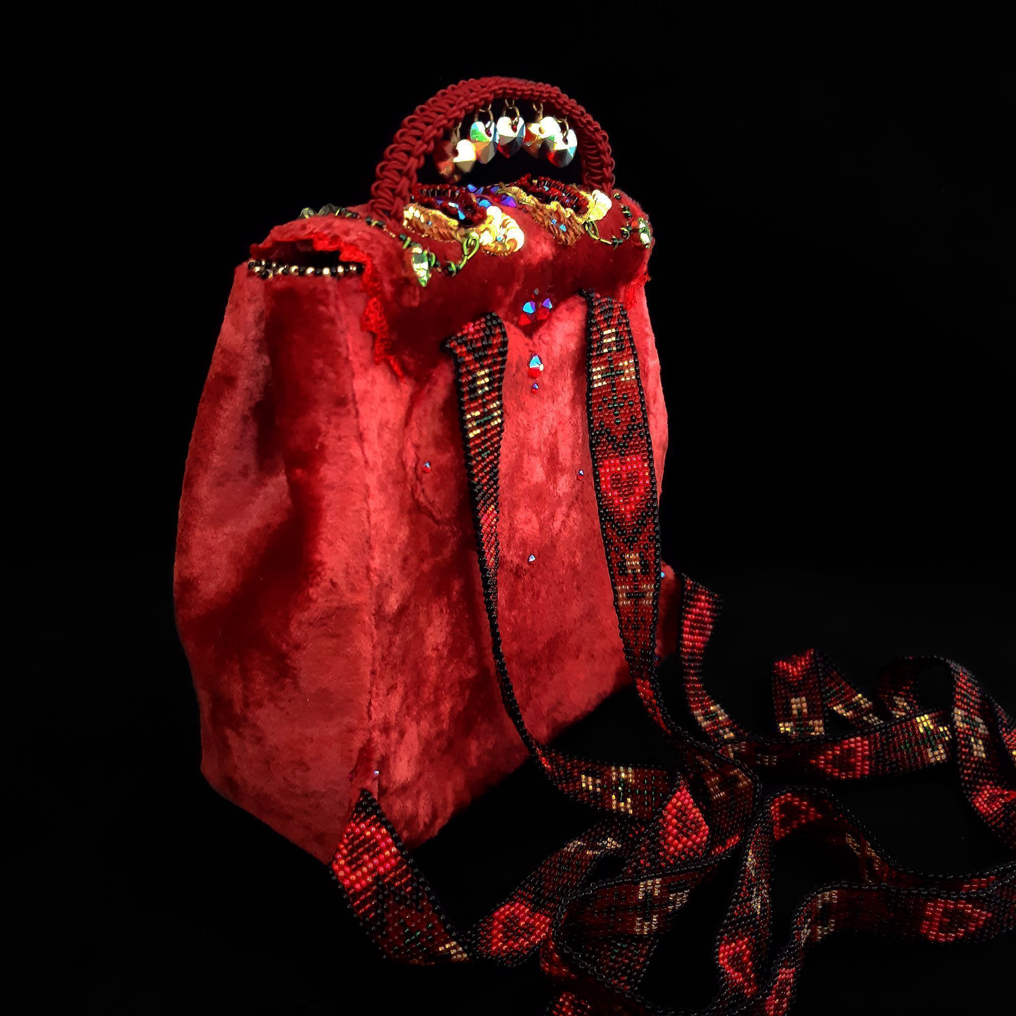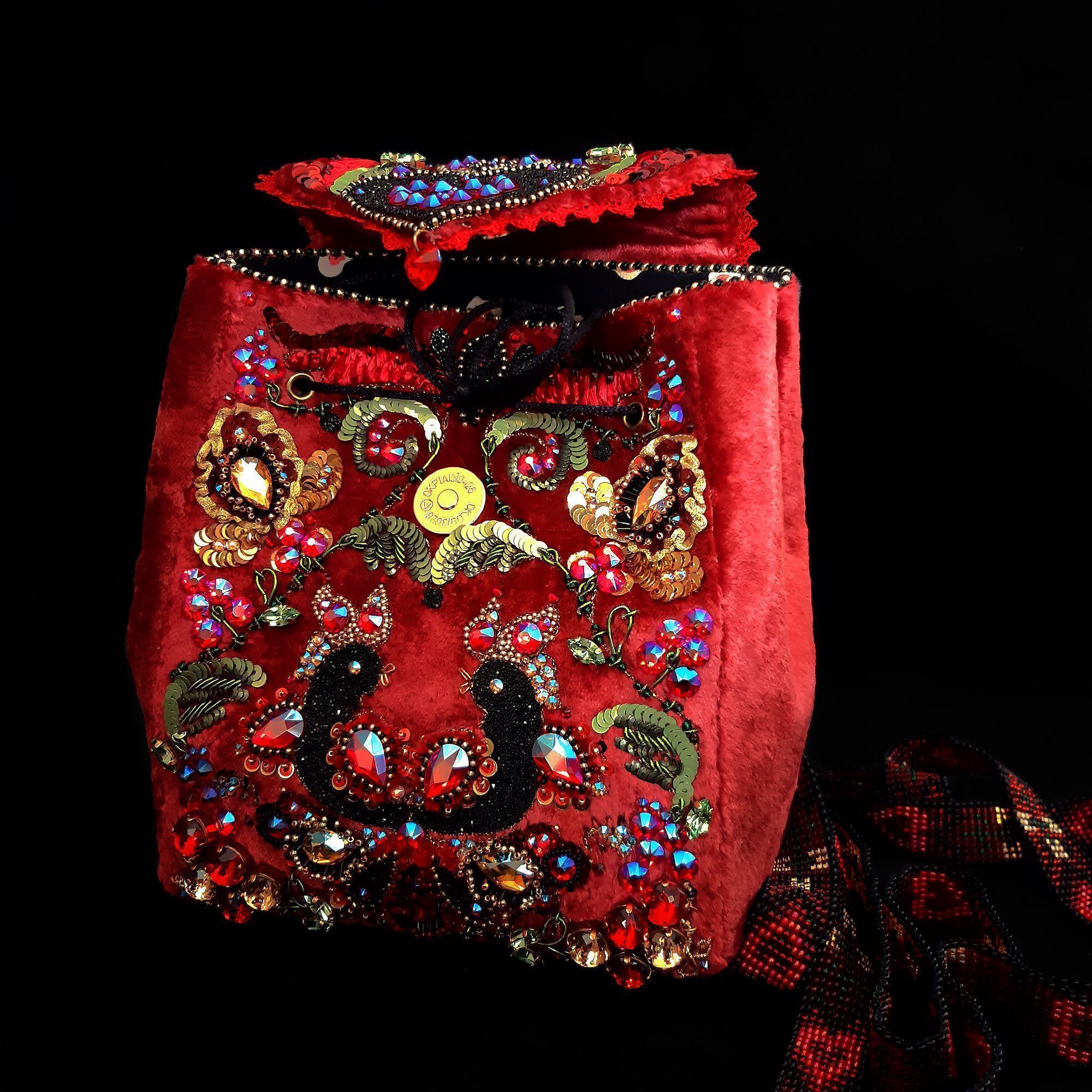 Материалом основы послужил советский плюш (нестандартный материал для изготовления сумок). Я решила его использовать, чтобы показать уют и мягкость рюкзака, как плюшевая игрушка. А в сочетании с четкими гранями кристаллов он приобрел изысканный вид.