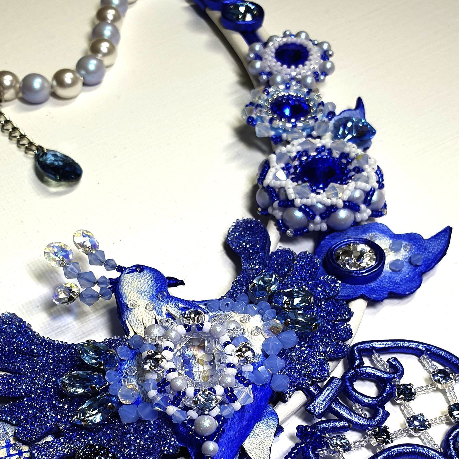 Услышав впервые название конкурса «Crystal Love», мне сразу вспомнилось выражение «Из России с любовью» - так и зародилось название колье. Захотелось создать украшение с самобытным характером, присущим культуре нашей страны. Рассмотрев конкурсные кристаллы, я определилась с цветовой гаммой. Органичная комбинация белого и синего цветов кристаллов, хрустального жемчуга и натуральной кожи, характерные для русской народной росписи «Гжель». Сказочная птица, цветы, листочки соединились в одно целое. Роспись по коже и блеск кристаллов эффектов Ignite, Shimmer, Opal дополняют друг друга. В центре колье сверкающая птица, держащая буквенное сердце с красным огоньком – любви к кристаллам Сваровски.