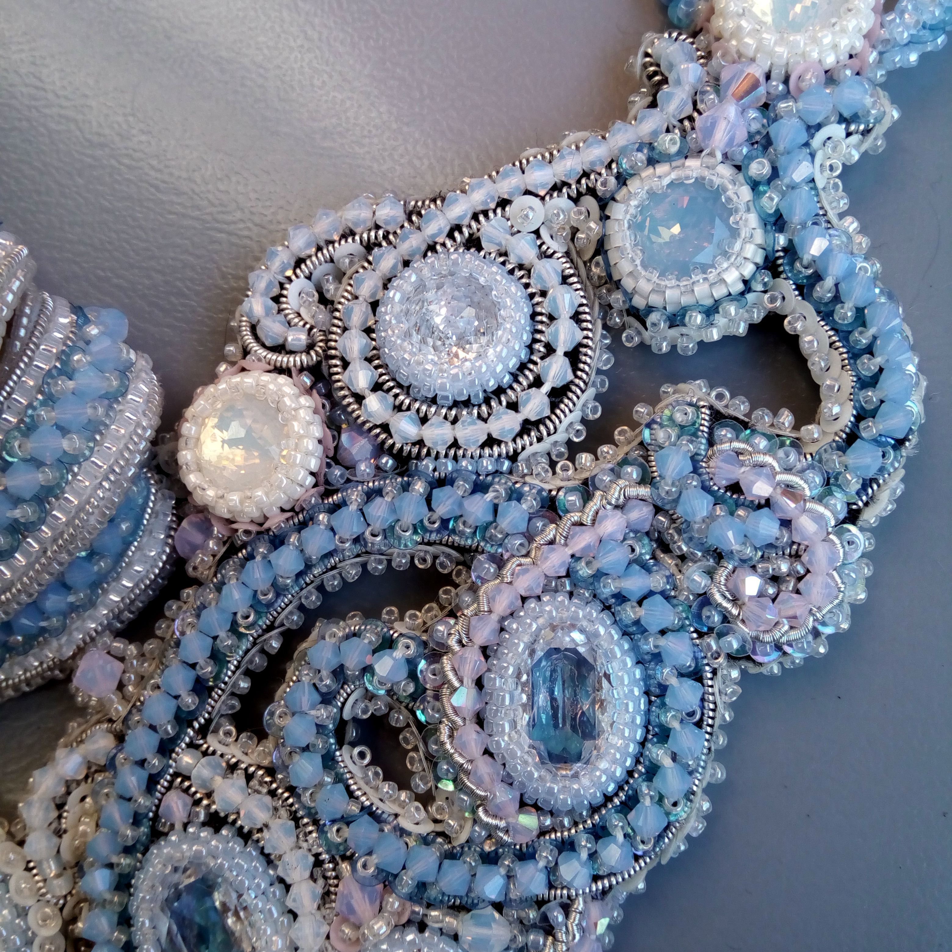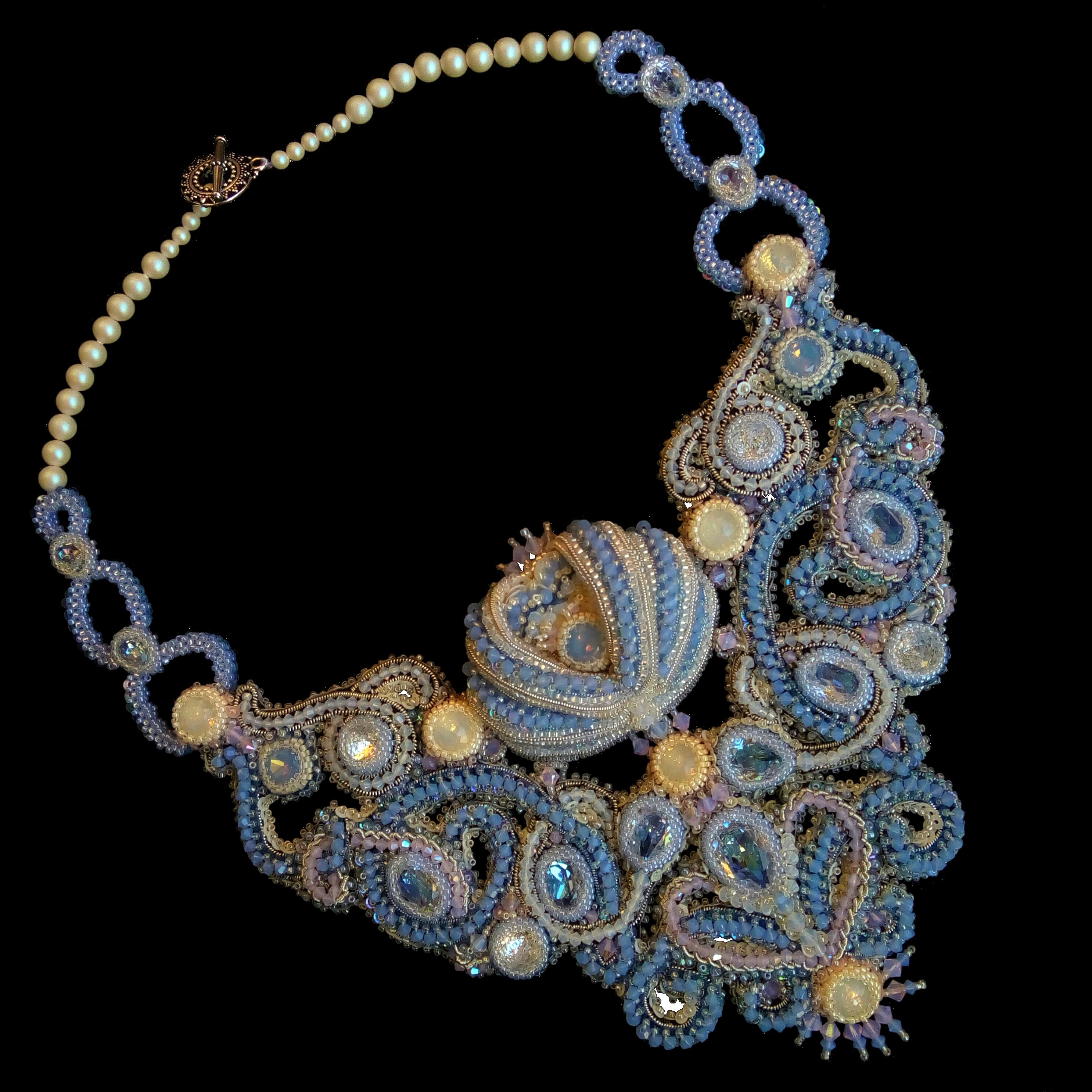 Мне не хотелось делать колье полностью в розовом цвете, поэтому для исполнения своей работы я выбрала самые традиционные свадебные оттенки: голубой, розовый и белый.
