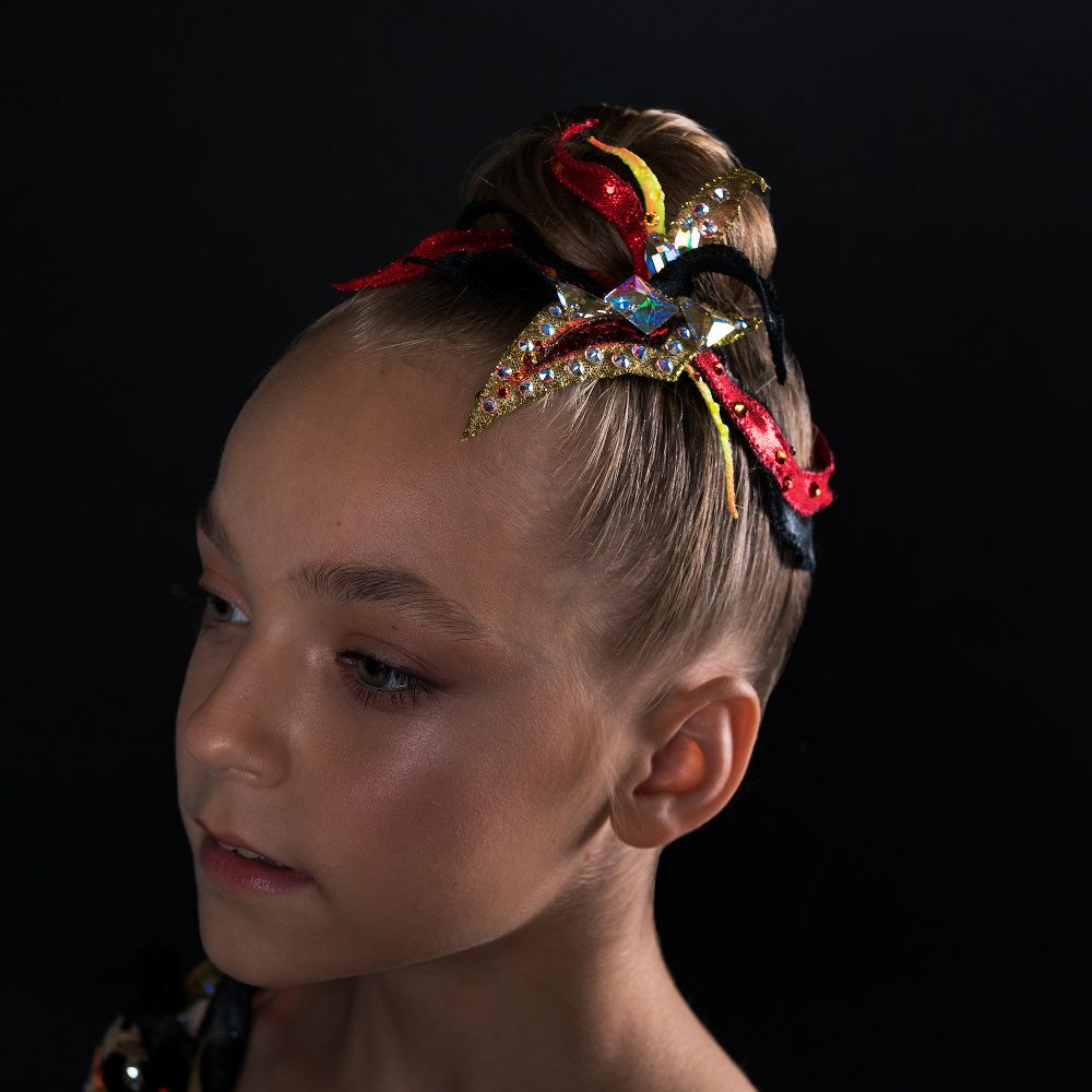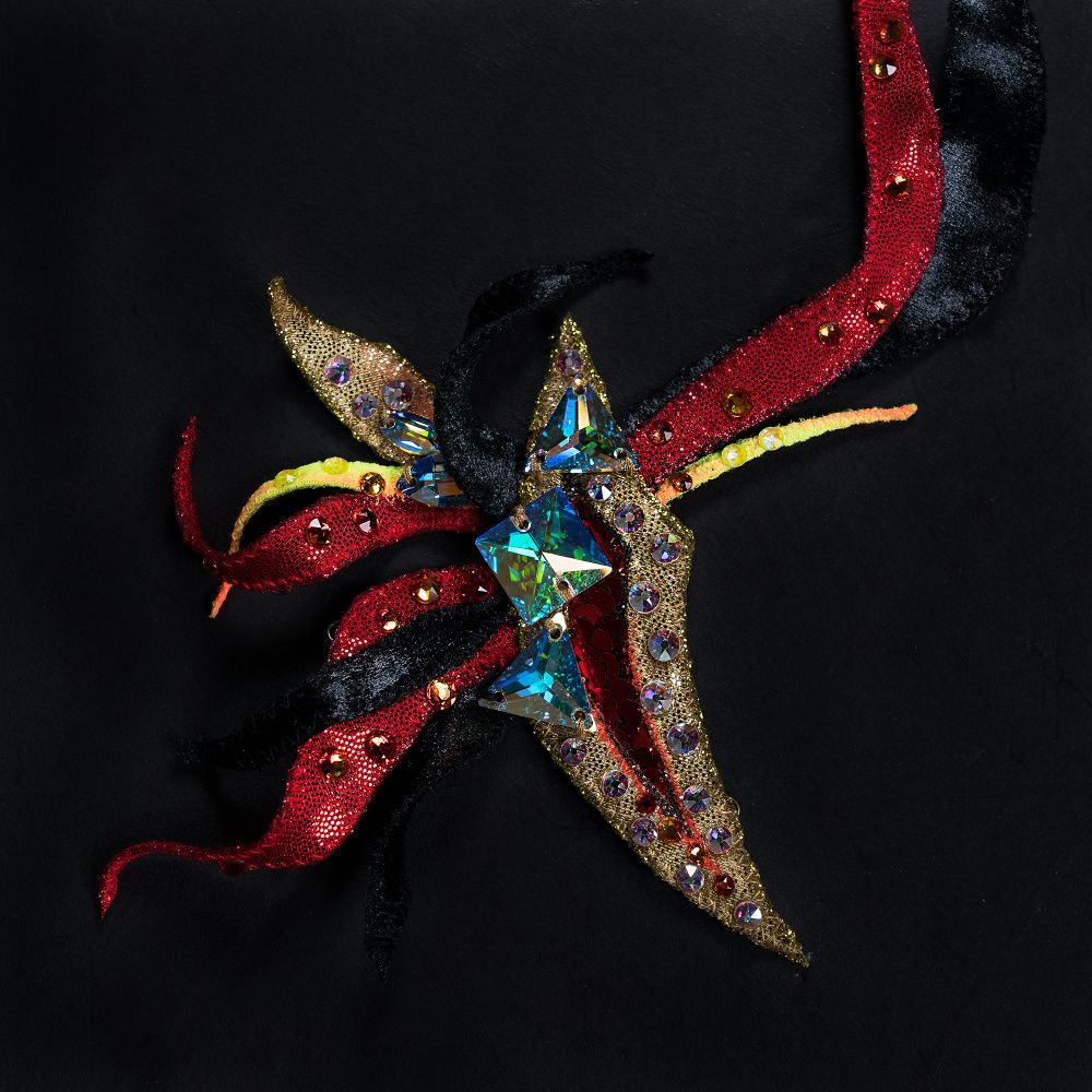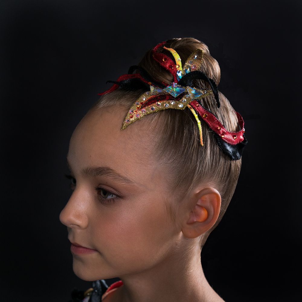 Головной убор выполнен в виде язычков пламени, собранные как лепестки в одном цветке. Цветовая гамма красного и чёрного подчёркивает уверенность, даже дерзость и некоторую таинственность образа. Золотые элементы, обрамлённые шикарными стразами Сваровски, придают роскошь обладательнице украшения.