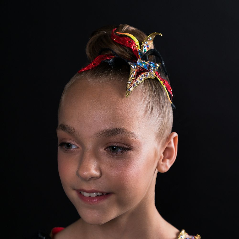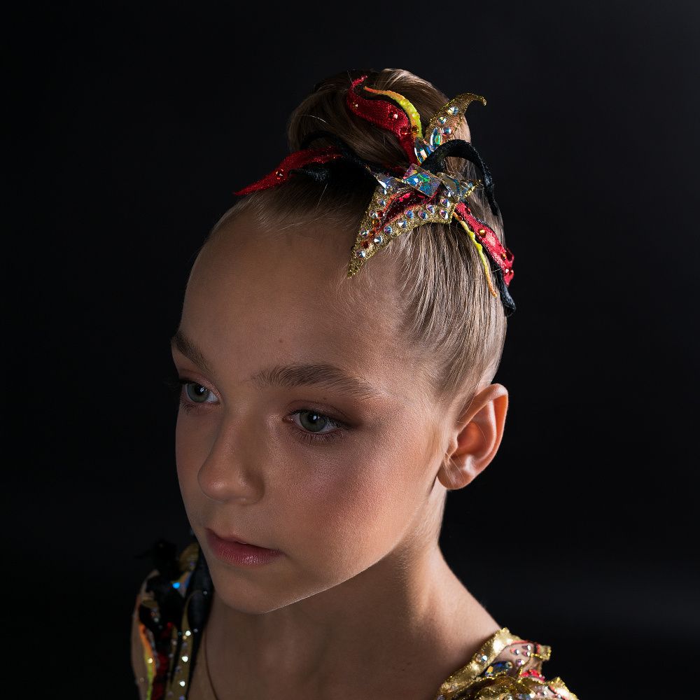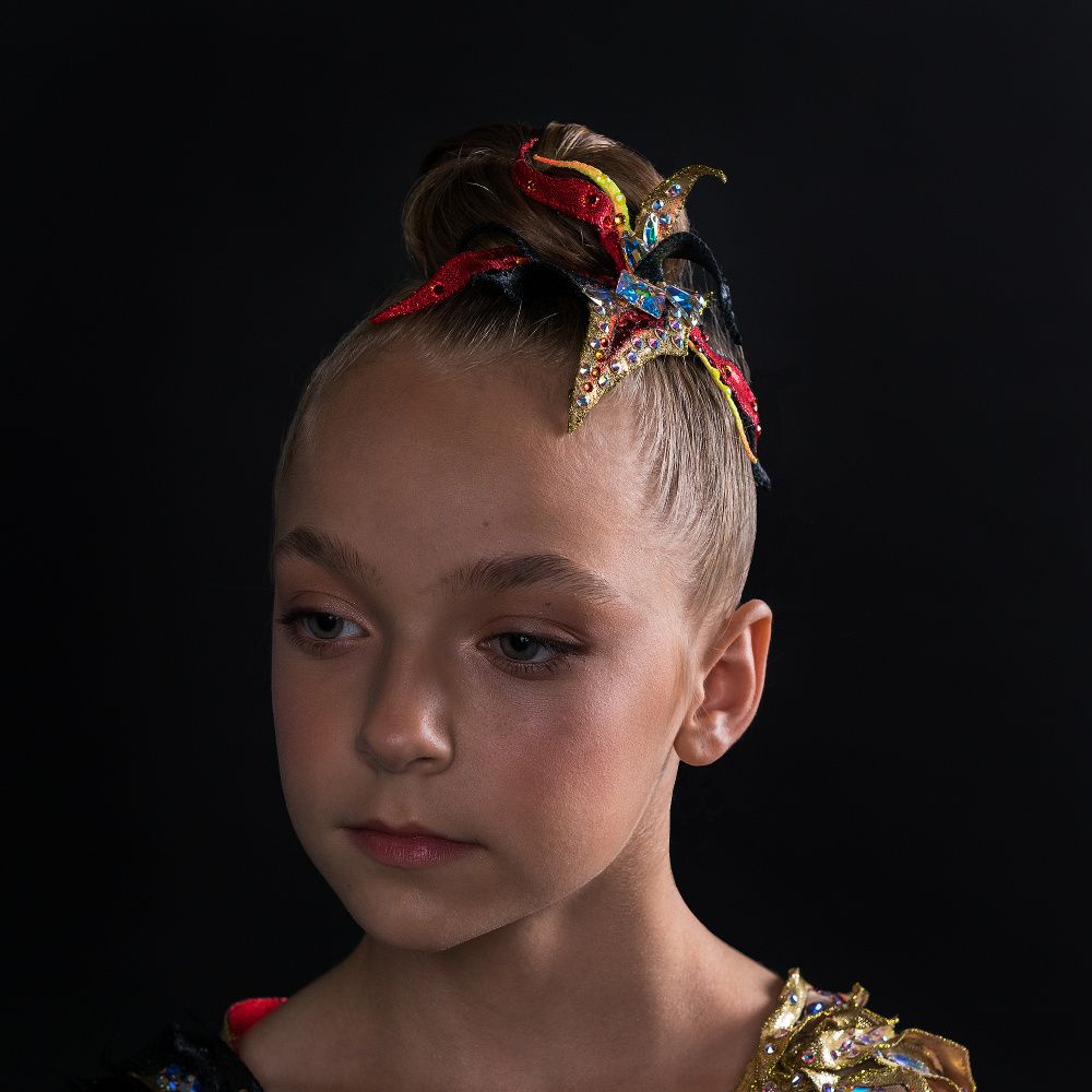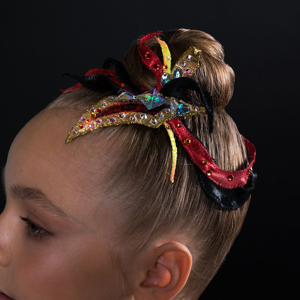 Головной убор выполнен в виде язычков пламени, собранные как лепестки в одном цветке. Цветовая гамма красного и чёрного подчёркивает уверенность, даже дерзость и некоторую таинственность образа. Золотые элементы, обрамлённые шикарными стразами Сваровски, придают роскошь обладательнице украшения.