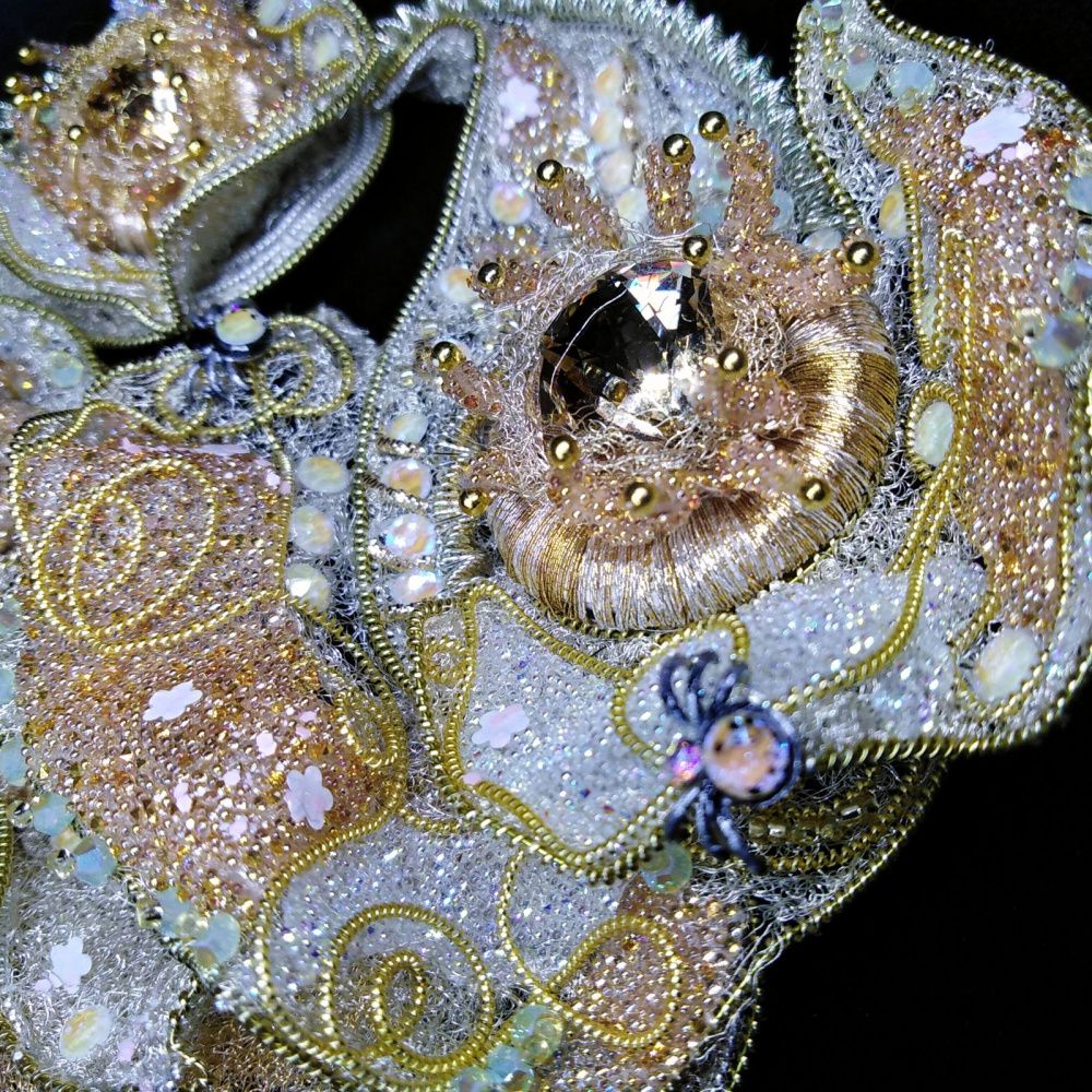 Название броши «Карамель в паутине» может ассоциироваться с женским романом или кондитерским десертом. Но именно простая карамель, рассыпанная на дорожке в парке, стала идейным вдохновением для создания украшения. Она так переливалась своей «медовостью» и « янтарностью», источая сладостный аромат под лучами солнца, что не могло оставить без внимания подползающих всякого рода букашек.
