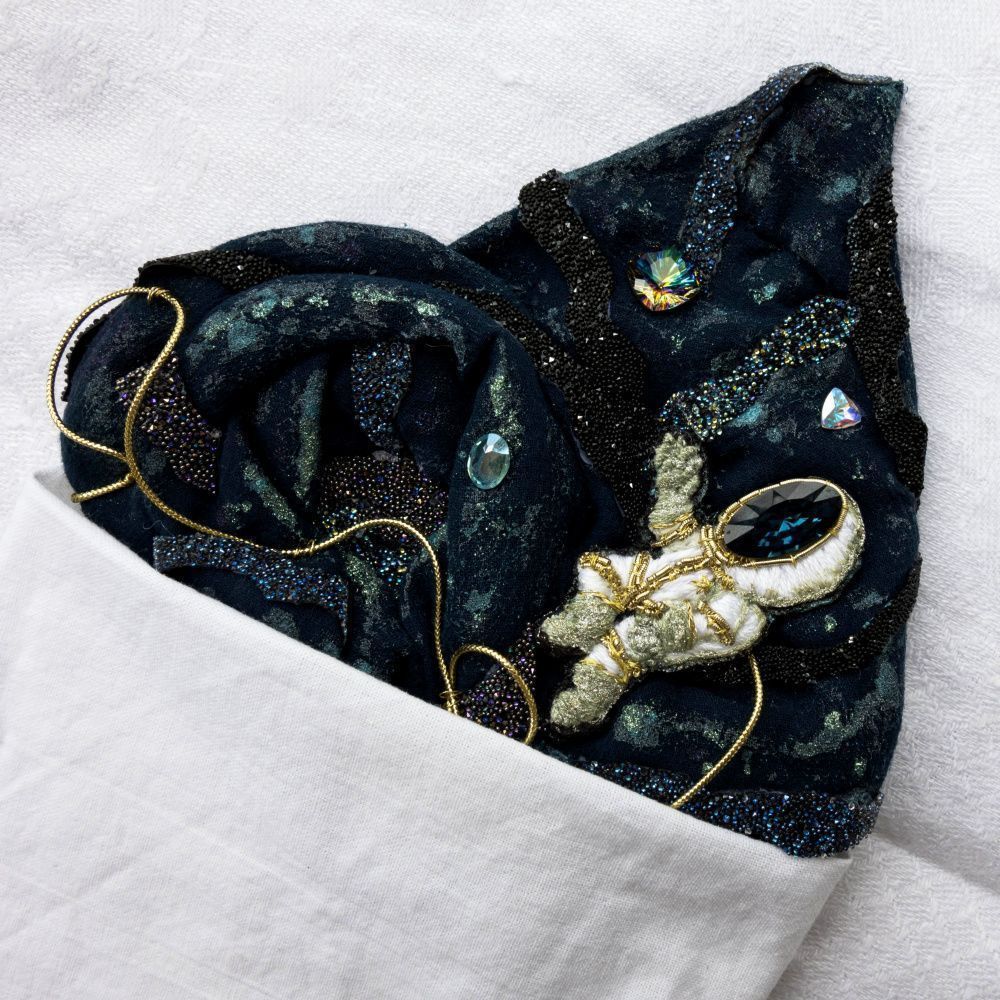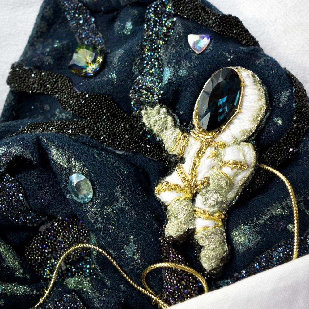 Одна из сторон личности моего супруга – это любовь к жанру научной фантастики, и именно поэтому платочек выполнен в виде маленького кусочка большого космоса, в центре которого – отважный исследователь, готовый к покорению