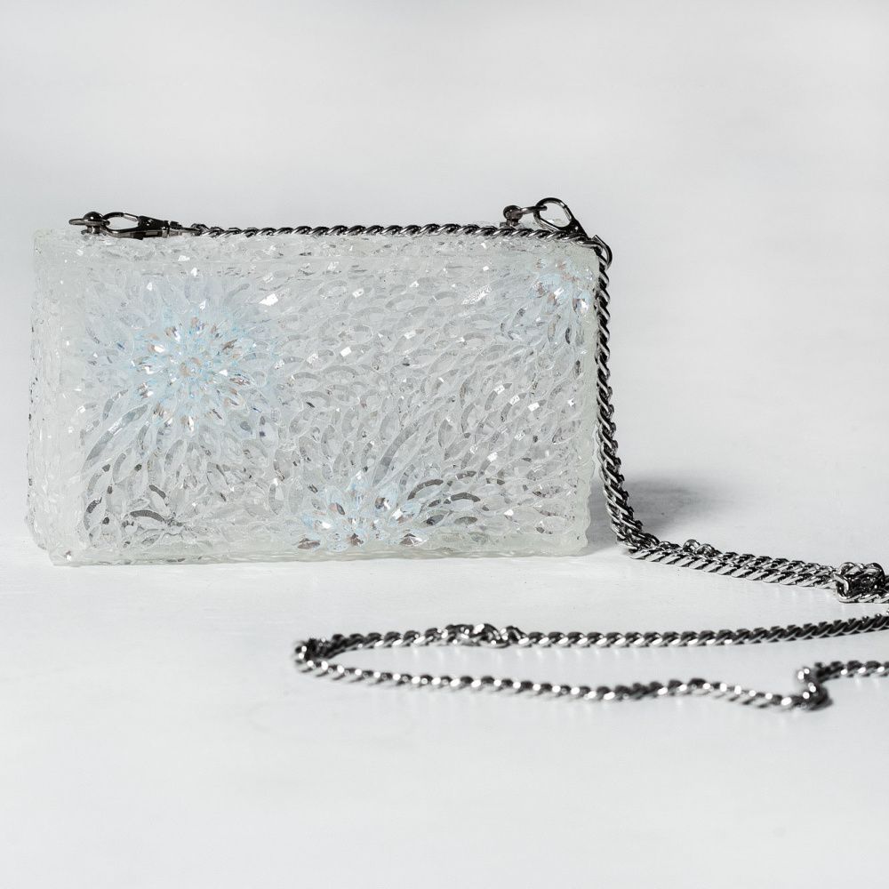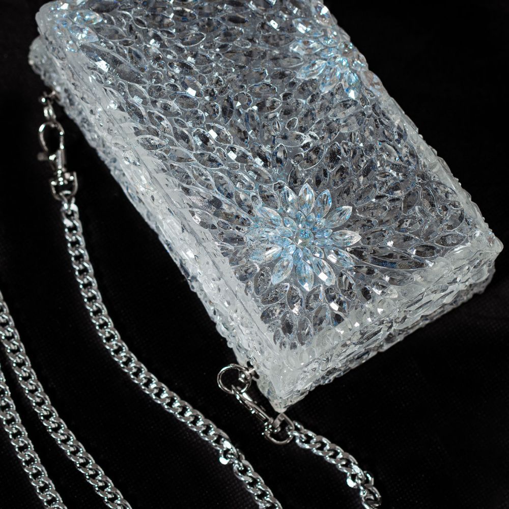 Сумочка отлита из эпоксидный смолы имитирующей хрусталь с вставками кристаллов Swarovski в цвете Crystal Ignite.