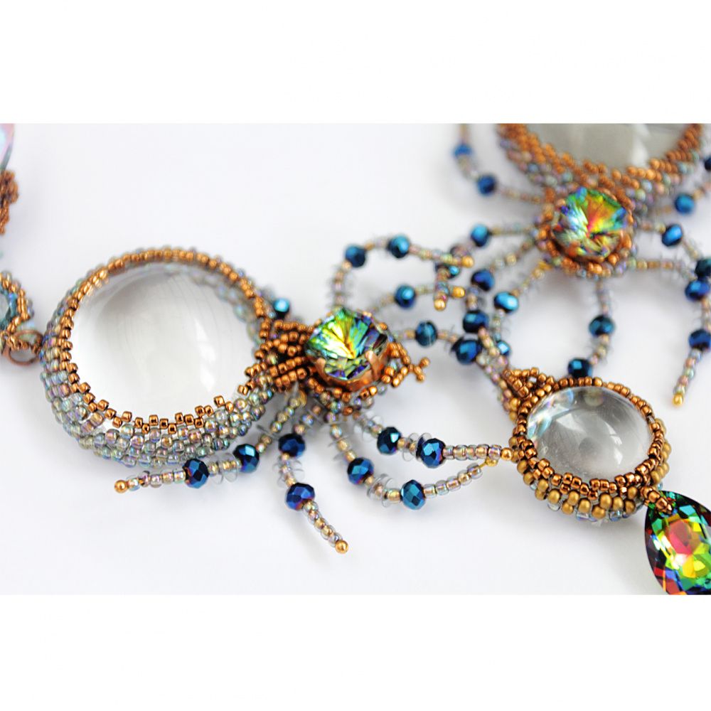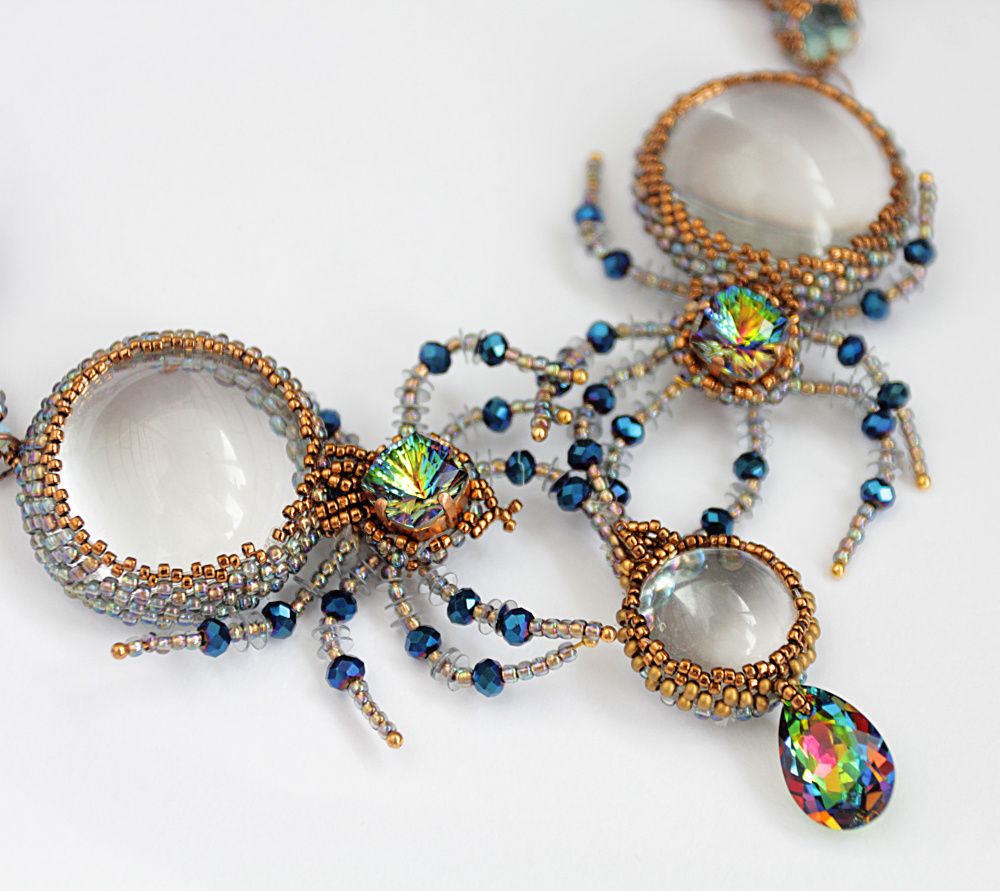 Очень хотелось показать,что обычный стеклянный кабошон тоже может сиять. Мои прозрачные, как будто созданные из воды пауки охотятся на таких же невесомых мух. Так я вижу новые грани сияния.