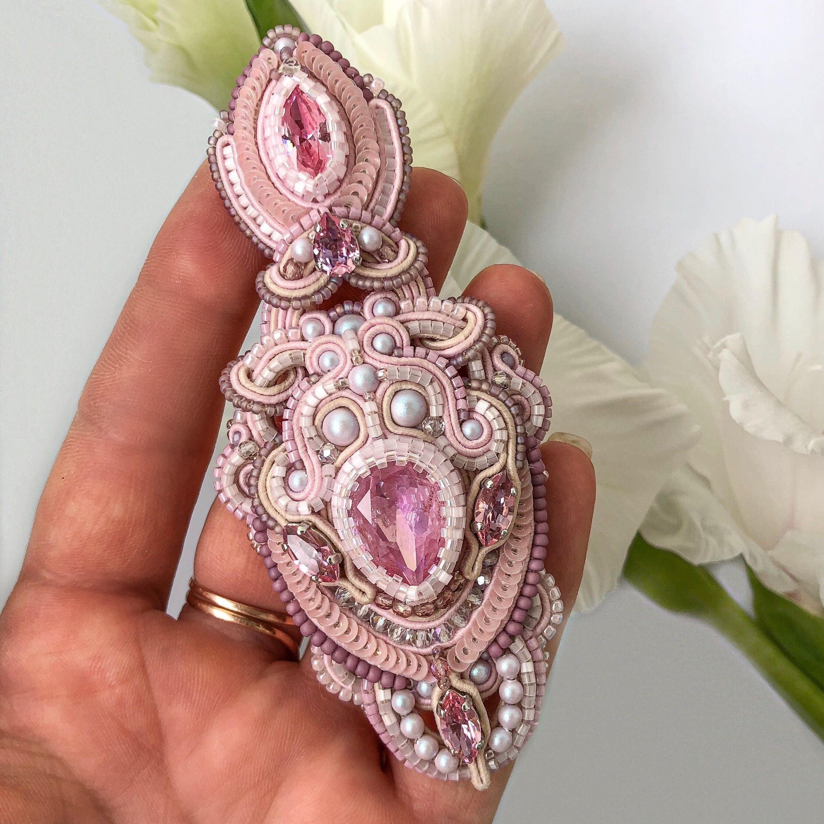 Блестящие нежные кристаллы словно искорки разгорающиеся в наших сердцах, сутажные завитки будто тёплые объятия. Цветовая палитра говорит сама за себя.
