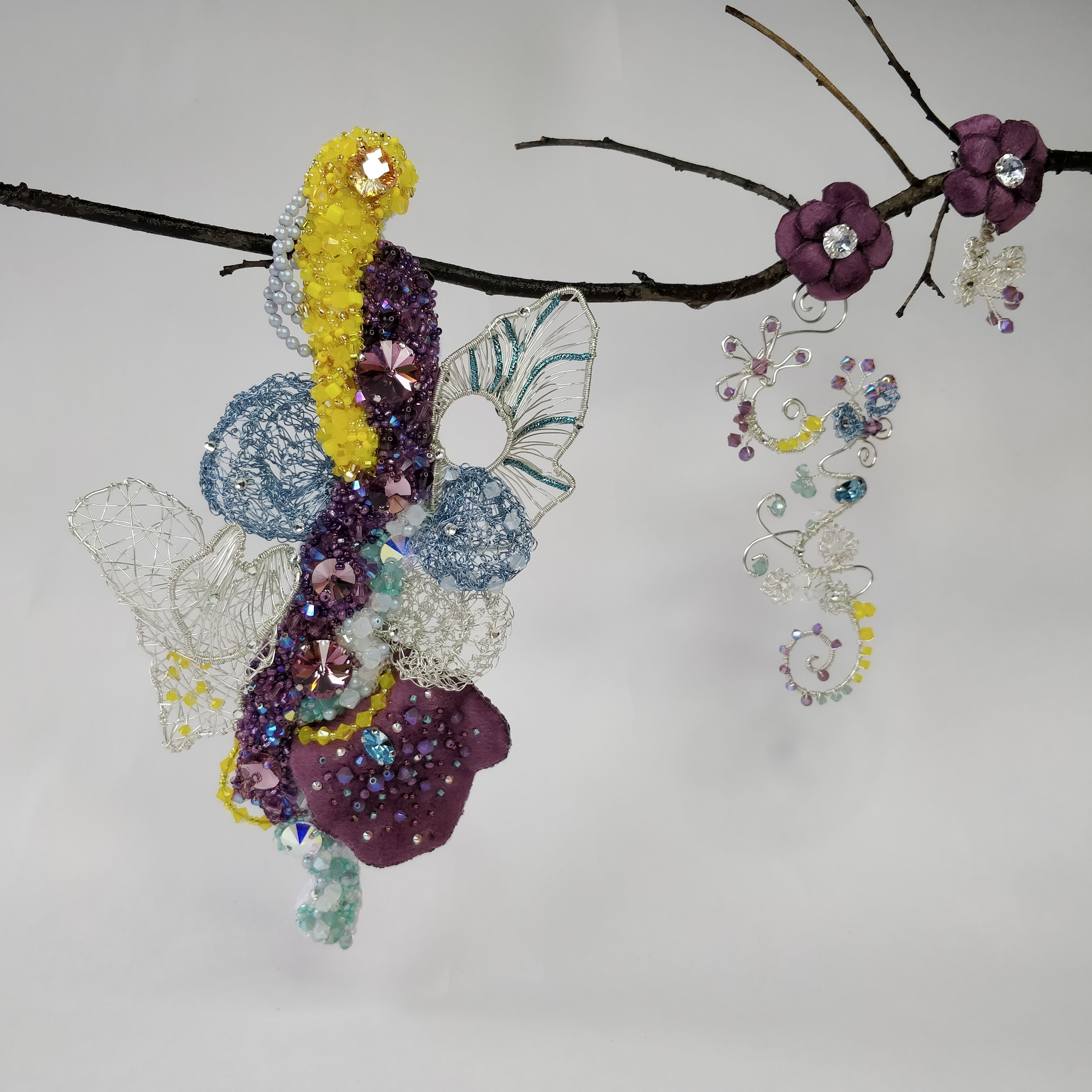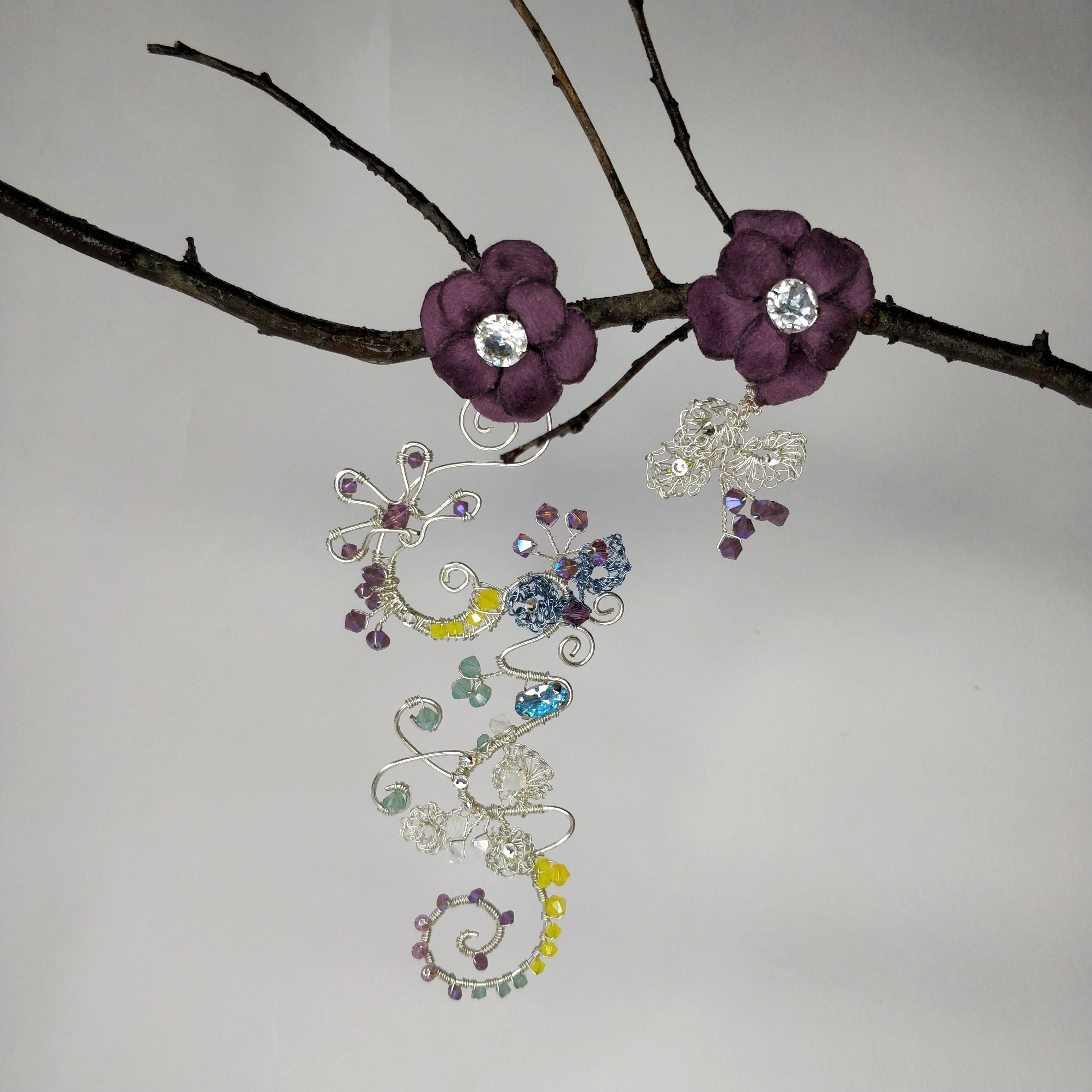 Август - это месяц смены времён года. Он разнообразен и эмоционален. Поэтому серьги "Сияние Августа" многогранны. Они богата смешением красок: от белого до темного аметистового, фактур: от нежного и теплого бархата до холодного металла, техник выполнения: плетение wire wrap, вязание.