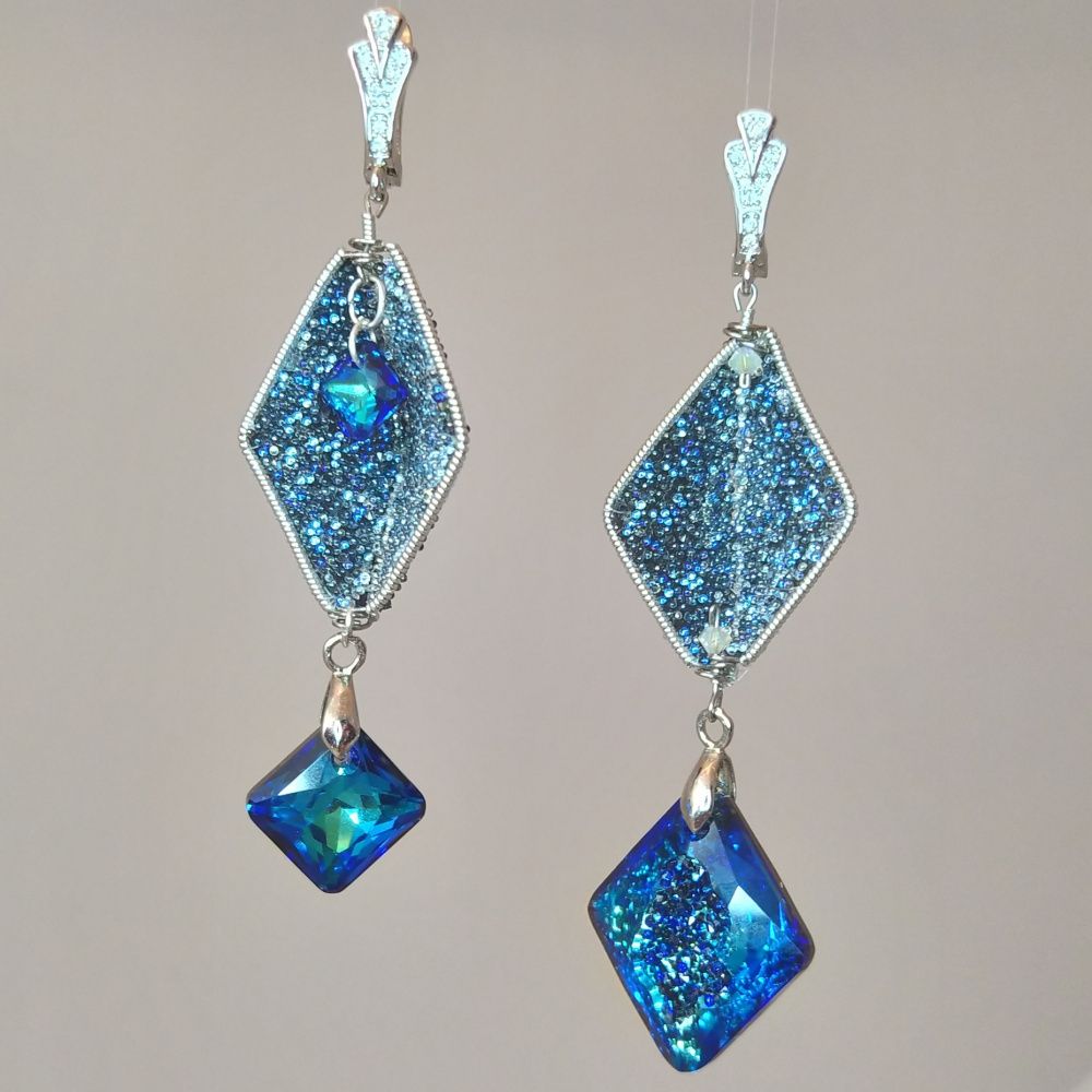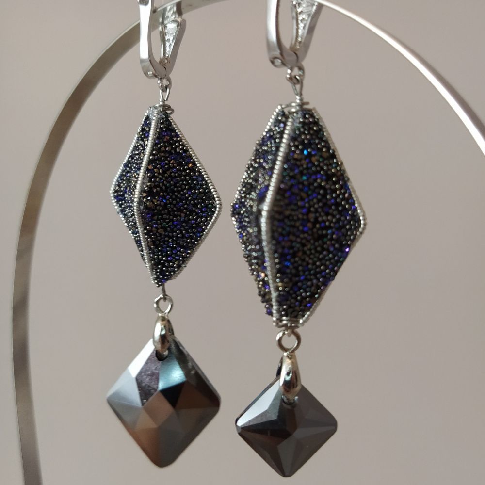 Серьги полны неожиданностей - новых граней. Это и две кристальные ткани - Transparent Crystal Moonlight и Black Crystal Moonlight, которые благодаря прозрачной основе первой дополнили друг друга и дали совершенно новый и неожиданный эффект. И ассиметрия, и разные подвески - всё продолжает и поддерживает тему неожиданных новых граней, которыми все время удивляет нас жизнь.