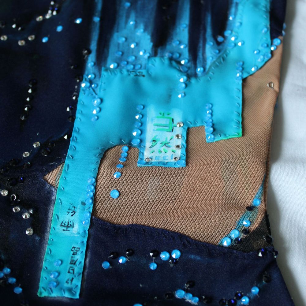 Вдохновленный кинокартиной «Бегущий по лезвию 2049» костюм стремится передать чарующее и футуристическое сияние ночного города, его ярких рекламных экранов и подсветки. Все слоганы на купальнике написаны на китайском языке. Для передачи буйства цвета неспящего мегаполиса использовались стразы линейки electric в цветах blue и green.