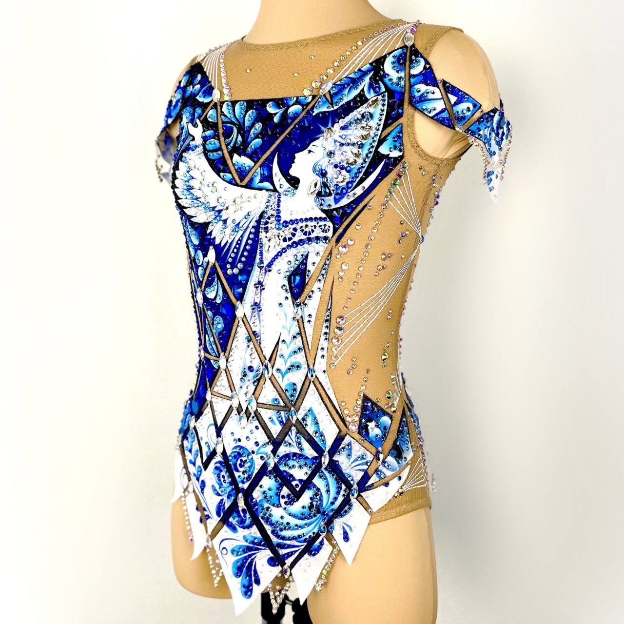 фарфоровая посуда в серванте, искусно расписанная гжелью, белые льняные нити,