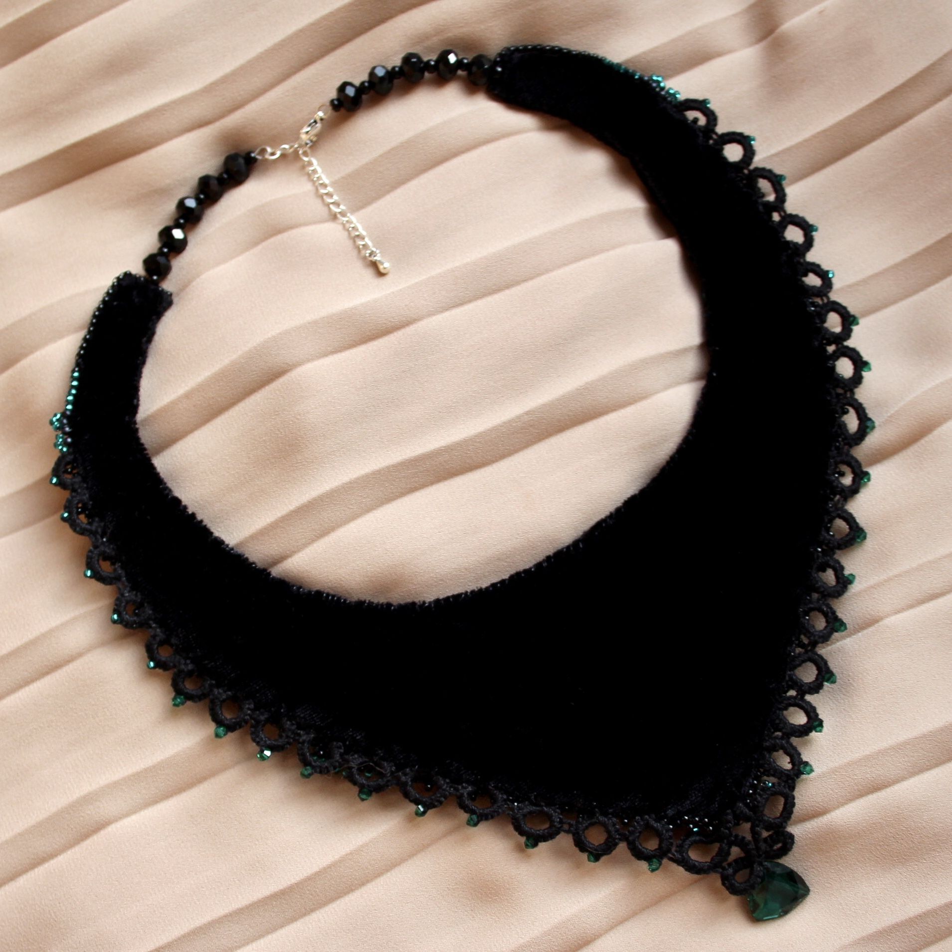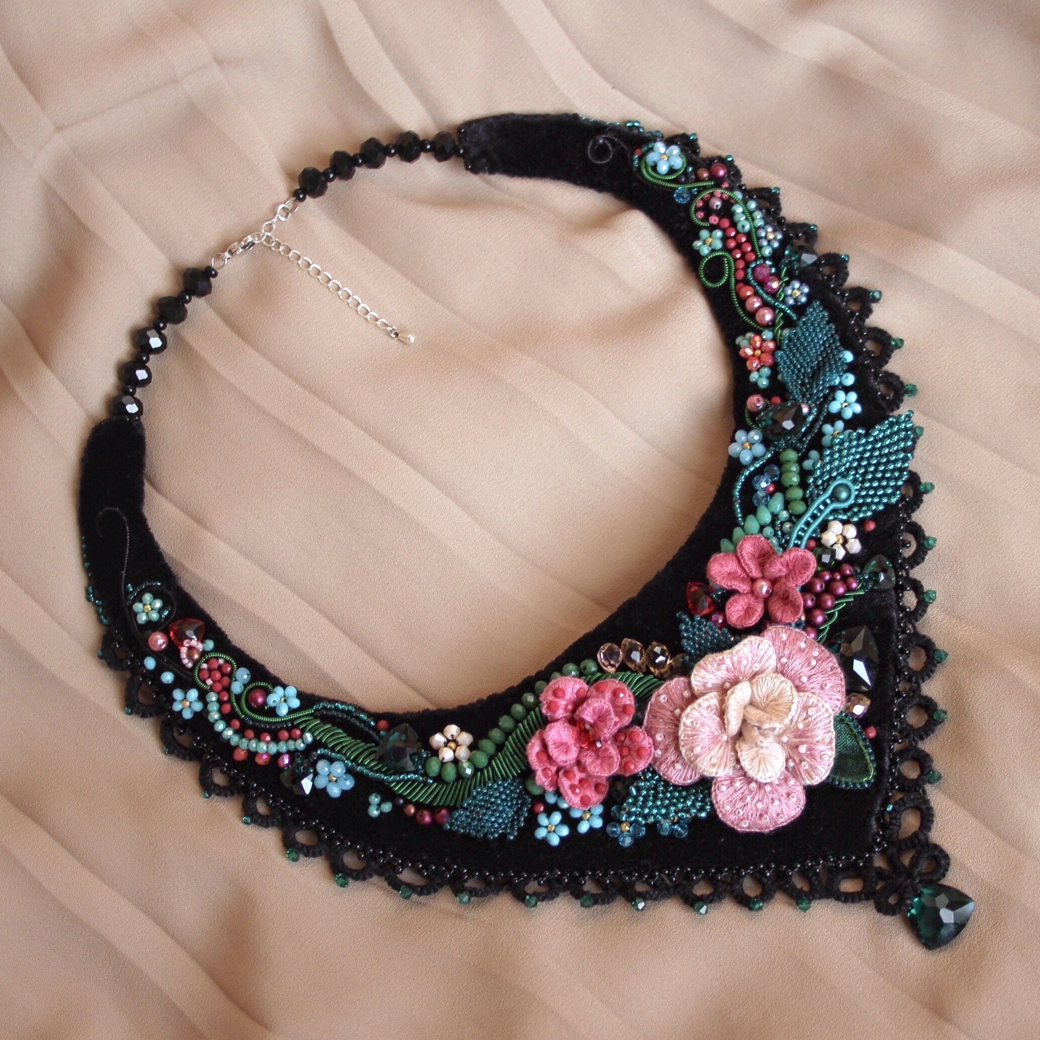 Часто с краю подноса прослеживались золотые узоры, роль которых в моем рукотворном колье выполняет кружево-фриволите, создавая интересный узор, соприкасаясь с кожей. Главные акценты работы – кристаллы триллианты в двух цветах: эмеральд и скарлет – выполняют роль закрытых бутонов и покрытых свеже выпавшей росой листьев. Крупные цветы, расположенные в центре колье, выполнены в технике объемной вышивки, листики – в технике мозаичного плетения, стебли в основном представлены канителью и вышитыми в ряд бусинами.