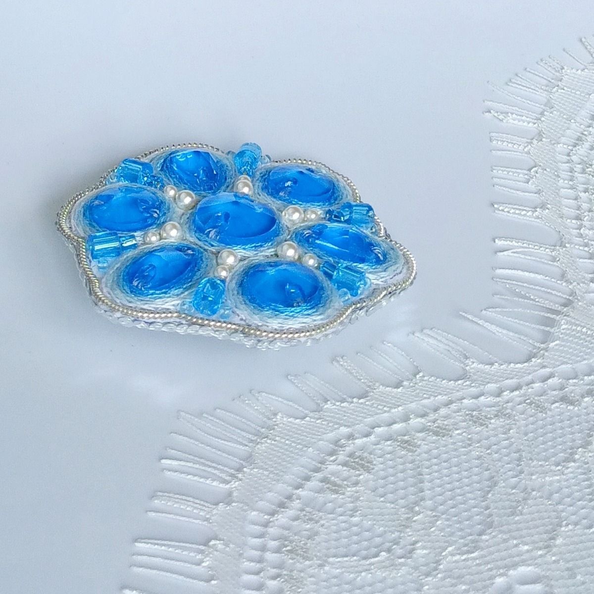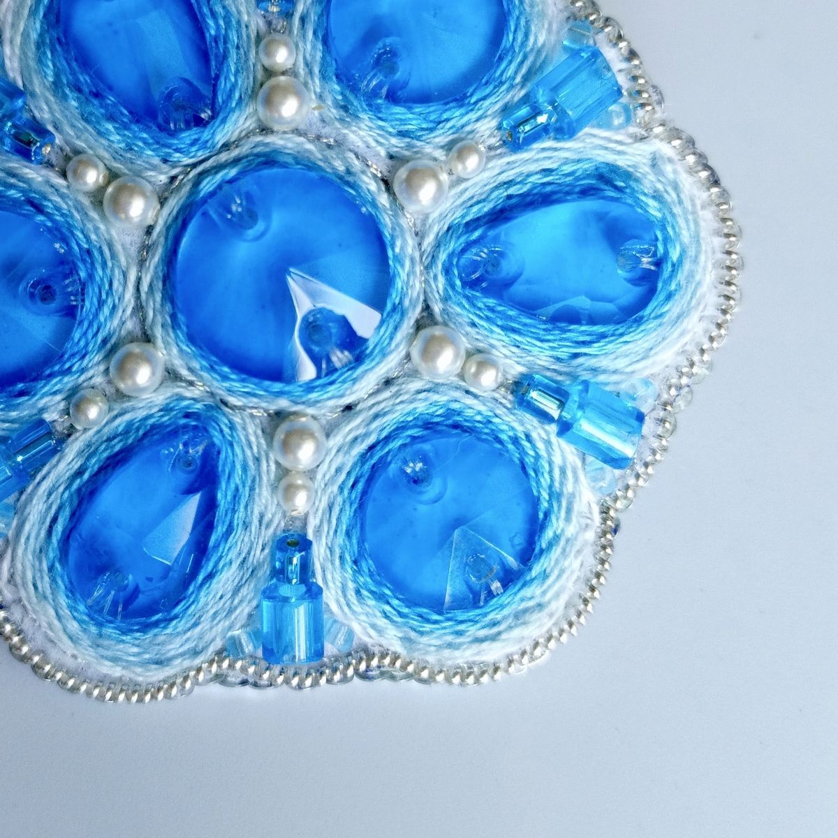 Также при изготовлении броши использованы металлизированные нитки мулине, жемчуг Swarovski двух размеров, цилиндрические бусины и бисер голубого цвета, жёсткая канитель. Изнанка у броши из белой натуральной кожи. На обратной стороне есть небольшое колечко, поэтому изделие можно использовать и в качестве кулона.