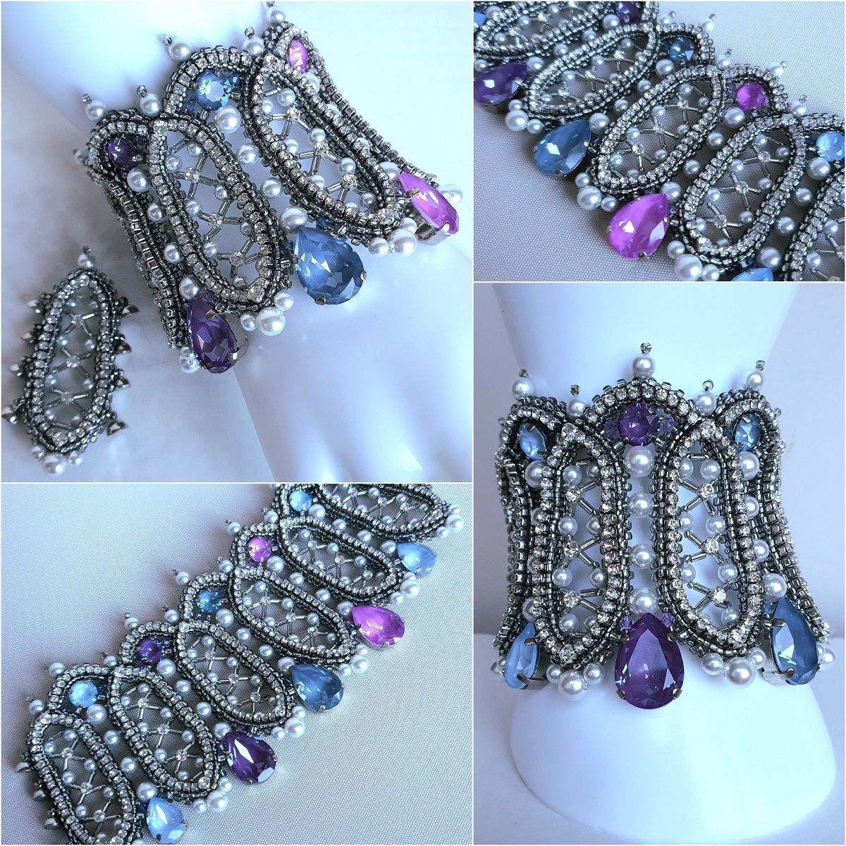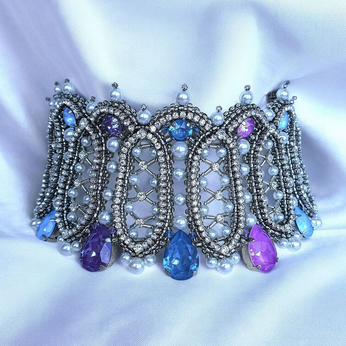 Вдохновением к моей конкурсной работе послужила эпоха барокко. Именно в это время становятся популярными корсеты, жемчуг и кружево изобилуют в нарядах европейских модниц. А из архитектуры того периода мной были позаимствованы эллипсоидные формы оконных проемов и потолков. Все эти атрибуты и элементы стиля барокко мне захотелось отразить в работе. Акцентами выступают кристаллы с эффектами электрик и Ignite в сиренево-голубой гамме.