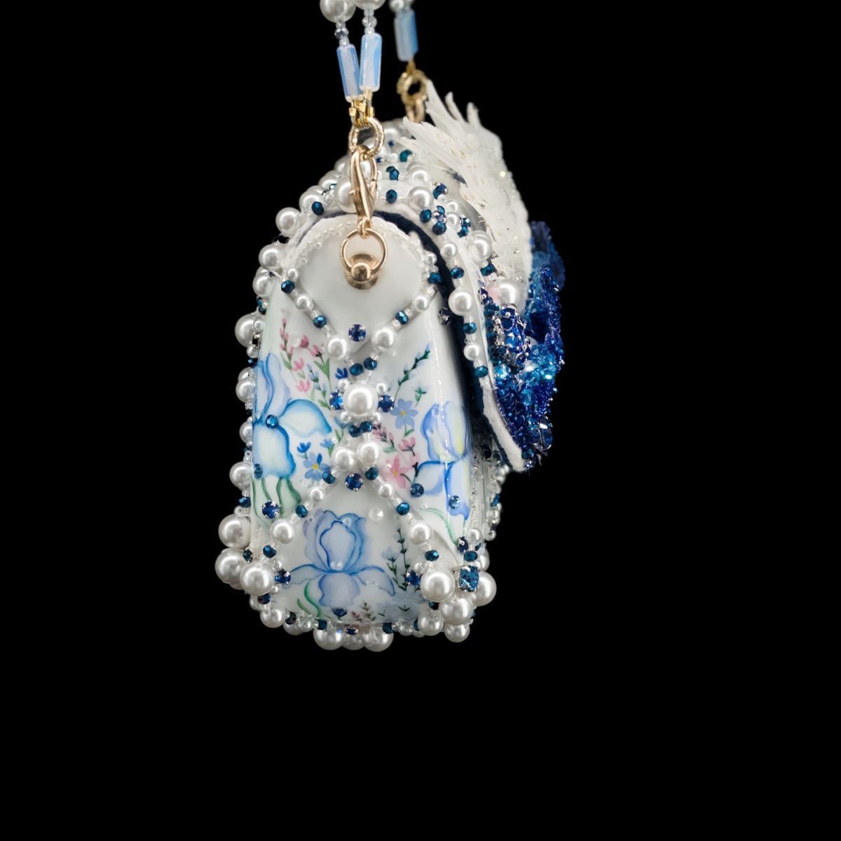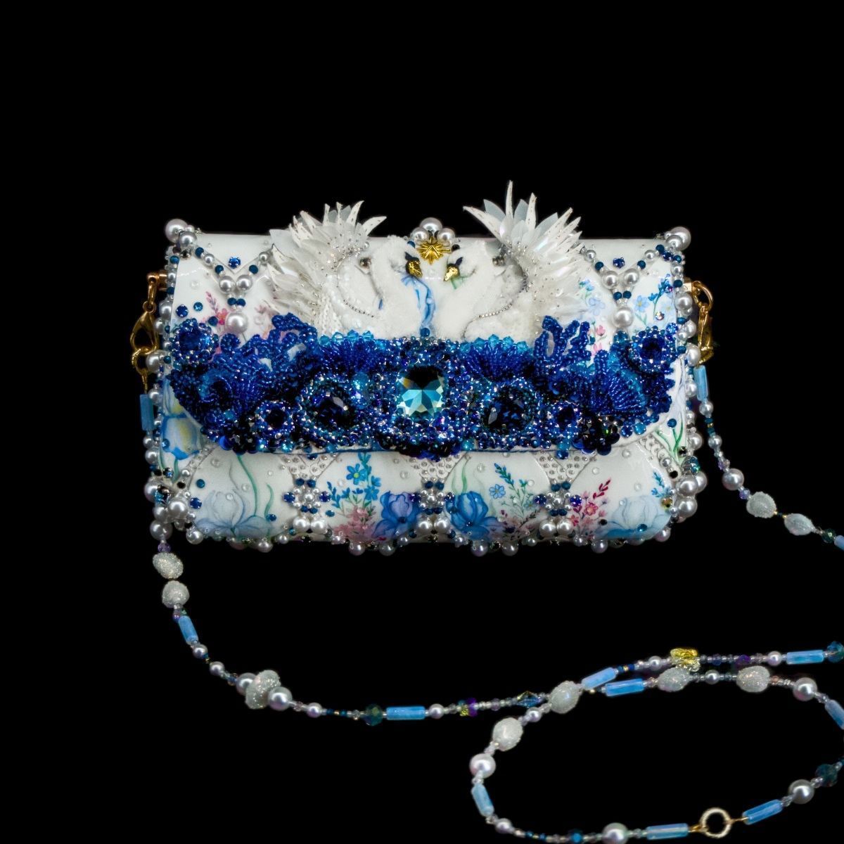 В представленной сумочке этот сюжет обрел свой символичный, счастливый финал, найдя свое отражение в мерцании хрусталя и жемчуга, в бликах расписного «фарфора», как напоминание о хрупкости, казалось бы, незыблемых идеалов и традиций.