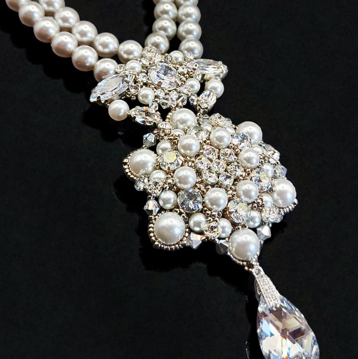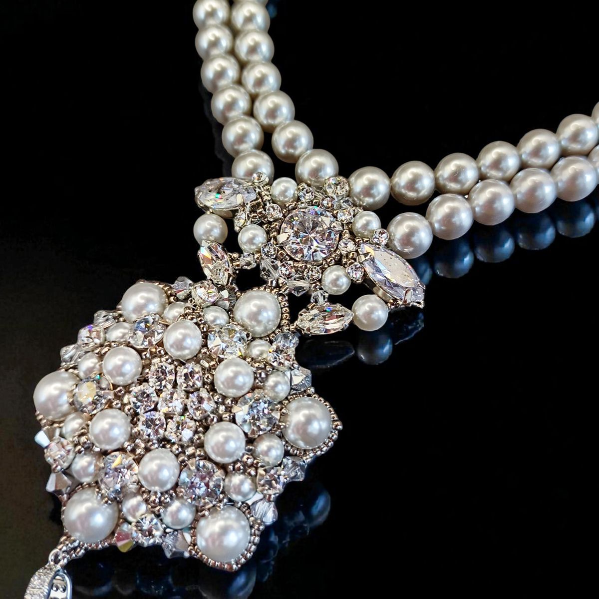 Это колье — воплощение аристократической элегантности и вечной классики. Две изящные нити жемчуга соединяются в роскошный кулон, переливающийся сиянием кристаллов и утончённым блеском жемчужин. Завершающий акцент — каплевидный кристалл, словно луч света, упавший из хрустальной люстры дворца Хофбург.