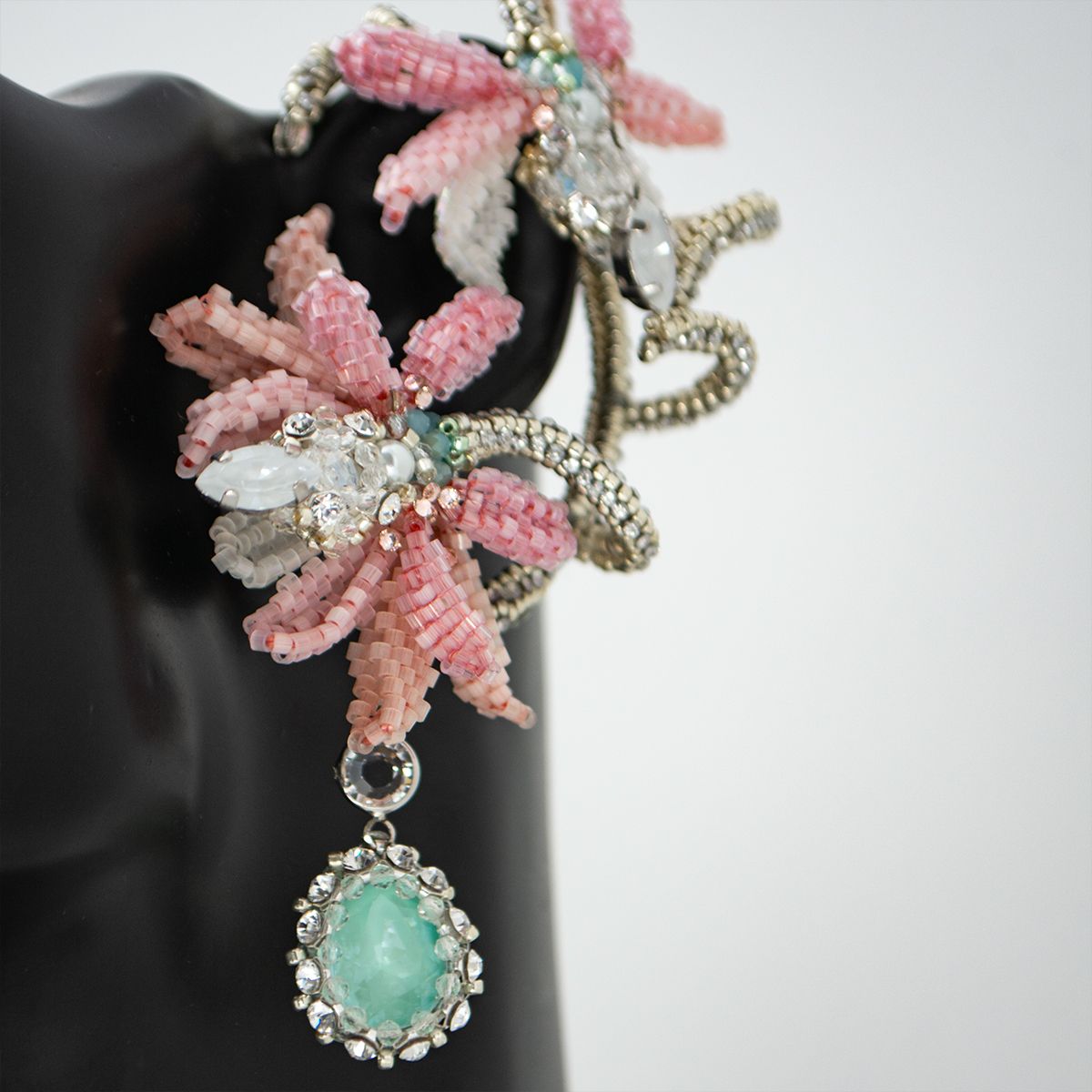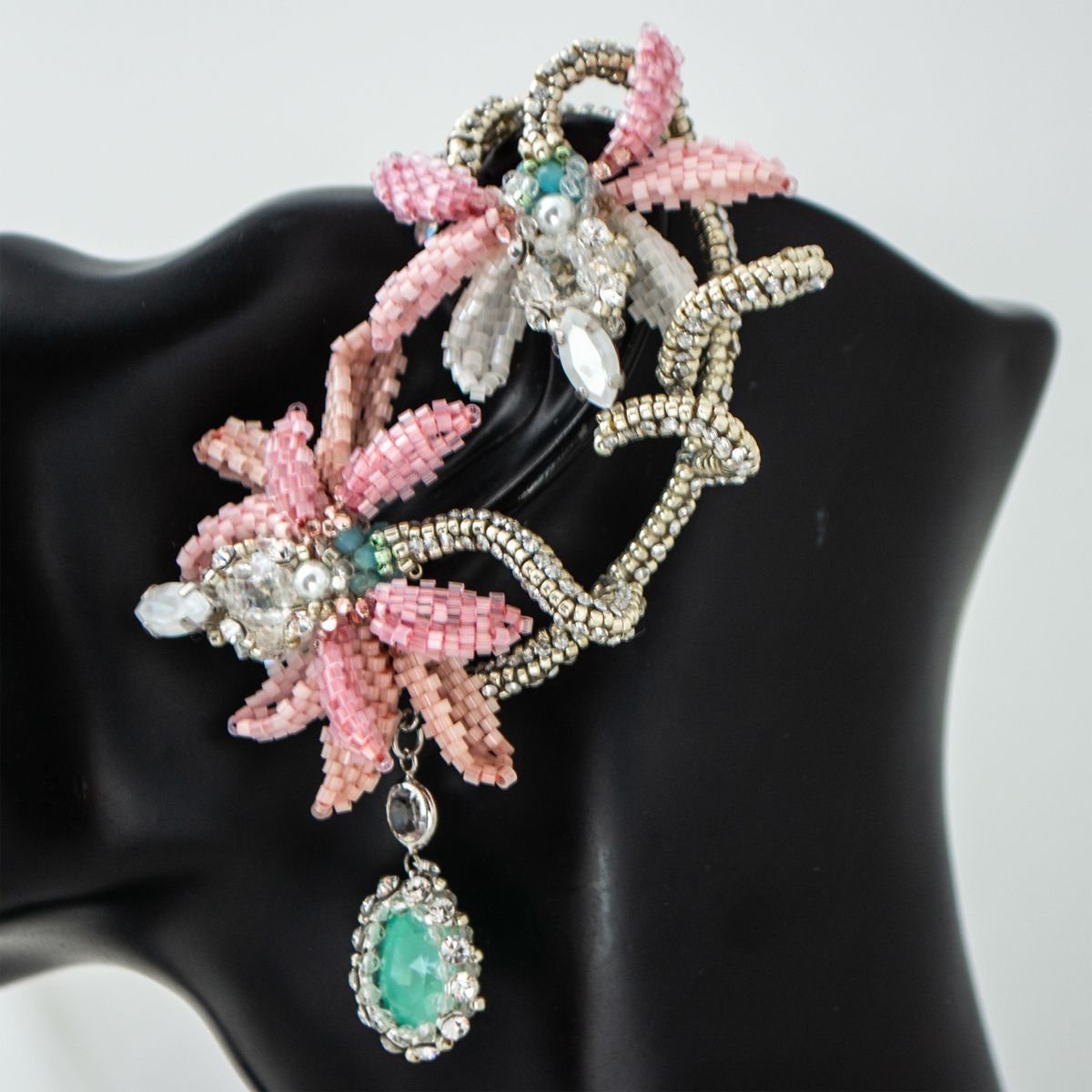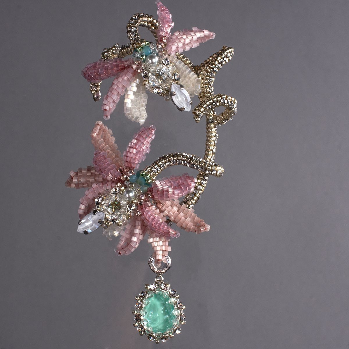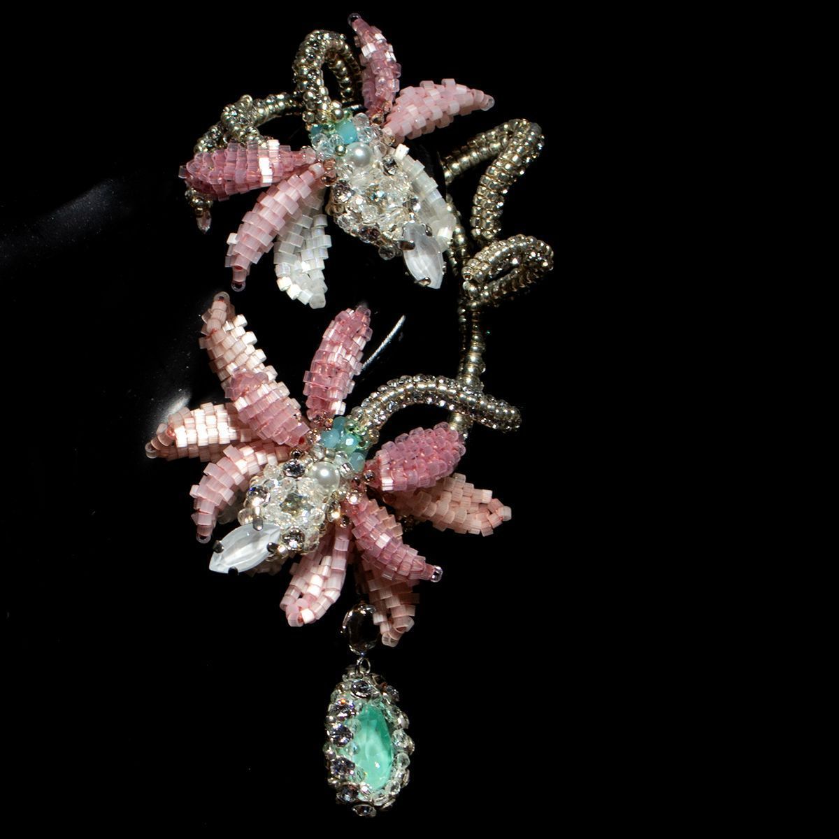 Можно ли в украшении запечатлеть мгновение вальса, пронизанное легкой грустью? Перед Вами кафф, сплетенный из серебряного бисера изящно повторяющий изгиб уха. Его обрамляют нежные лепестки, сплетенные из сатинового бисера, словно замершие в вечном танце; склонившиеся к изящному жемчужному бутону в центре — символу первой невинной симпатии. Из-под каждого соцветия Дицентры ниспадает единственная сверкающая слеза, раскрывающая символическое значение самого цветка, заключенное в сострадании и безграничной любви ко всему живому. Это симфония чувств и грации, квинтэссенция идеалов юной дебютантки. Застывшее мгновение между звуками оркестра и шуршанием шелковых юбок, воплощение самой сути Венского бала, сочетающего меланхоличную красоту цветка с бальной роскошью.